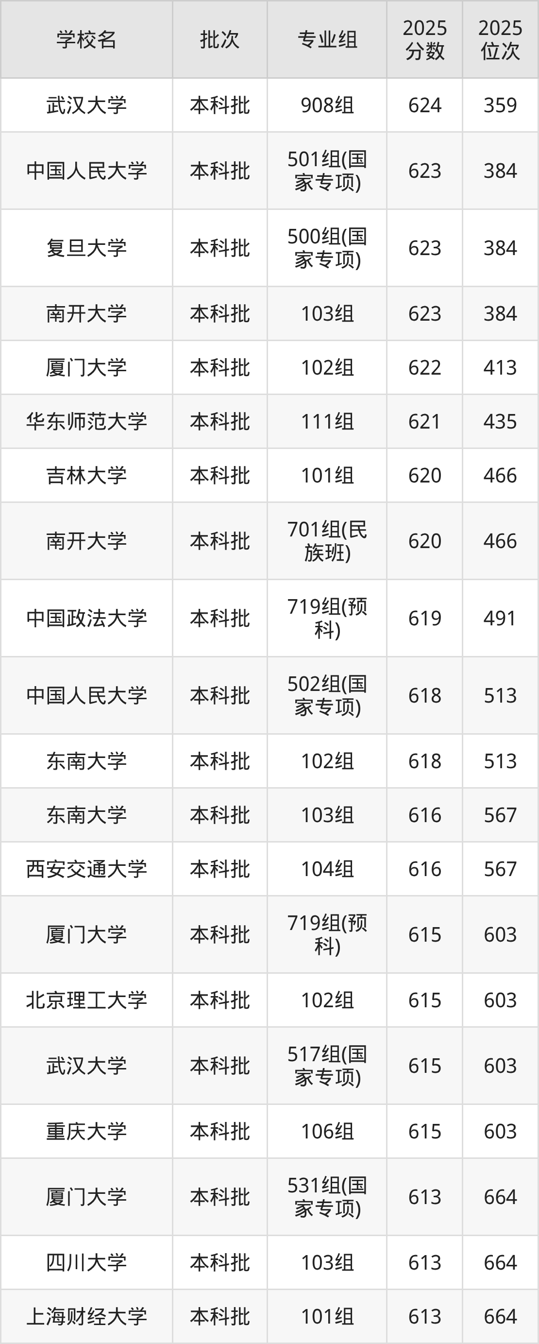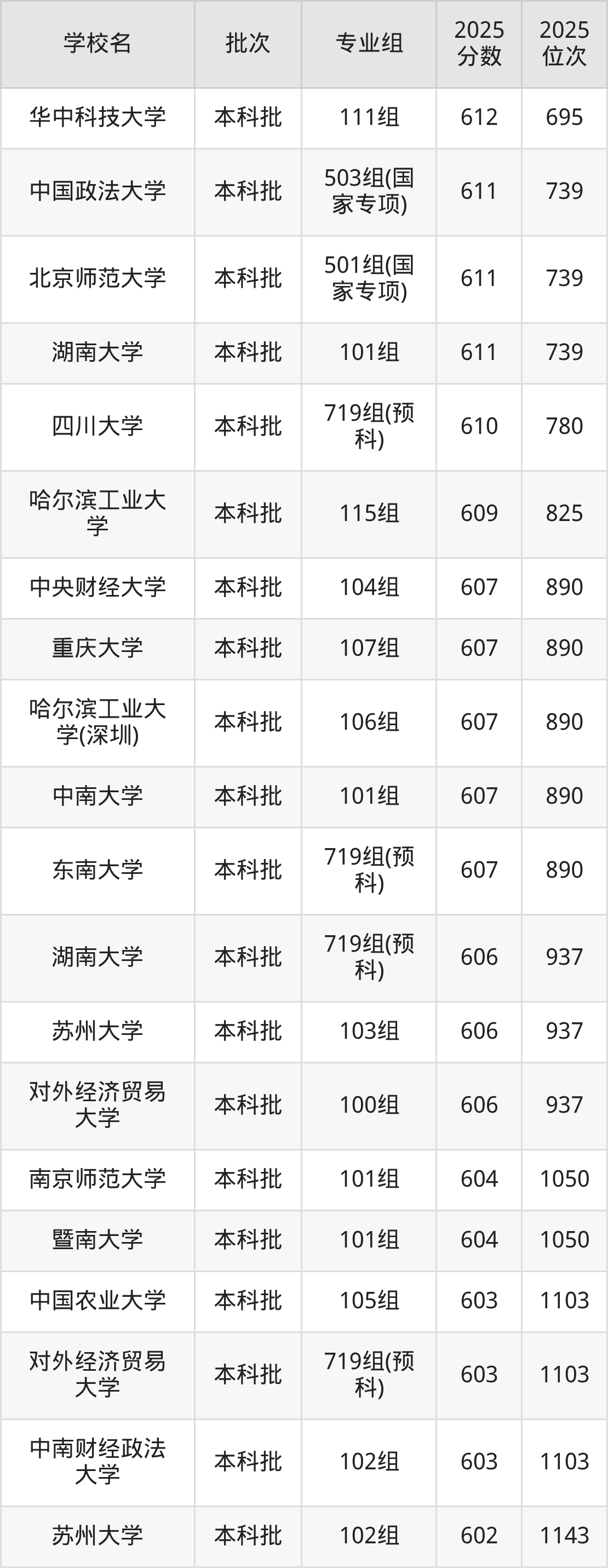 另外录取位次低于该区间(较稳妥)的有湖南大学719组(预科)(937名)、苏州大学103组(937名)等;录取位次高于该区间(可冲)的有哈尔滨工业大学115组(825名)、四川大学719组(预科)(780名)等。