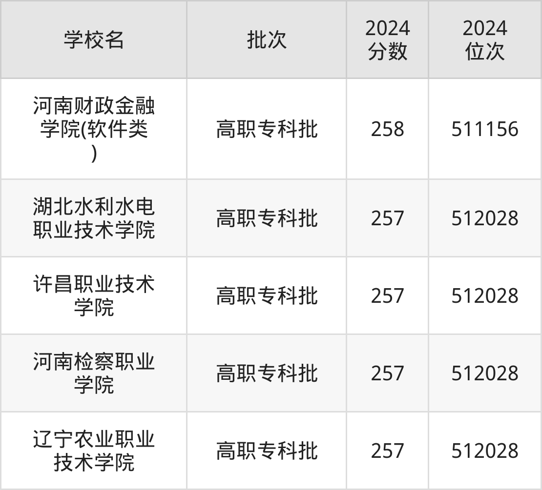 2024年河南高考理科257分(511158名~512029名)能上的大学有辽宁农业职业技术学院、许昌职业技术学院、湖北水利水电职业技术学院、河南检察职业学院。