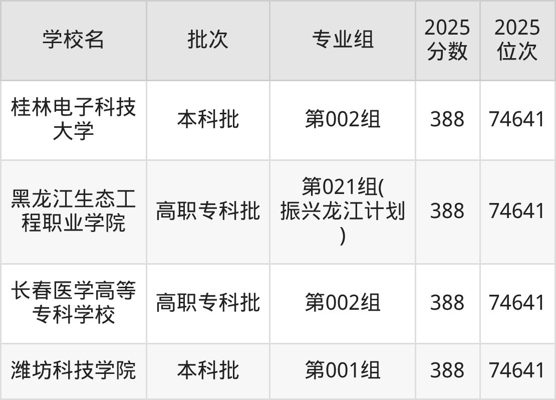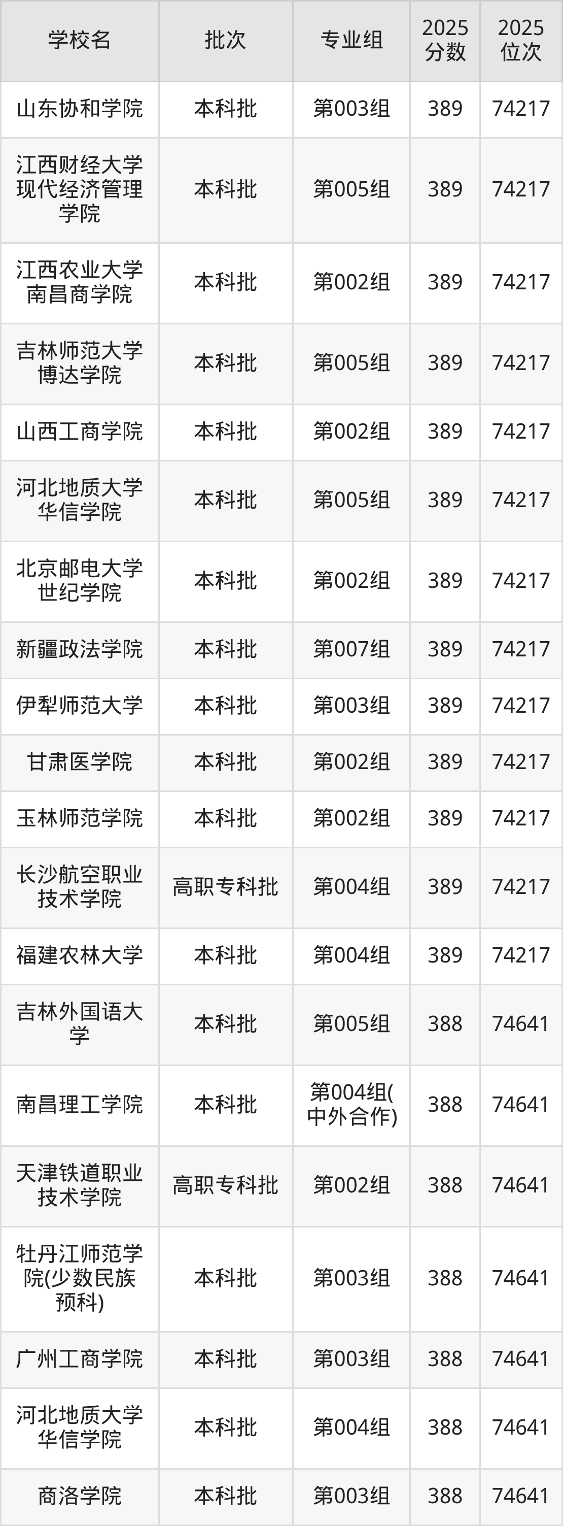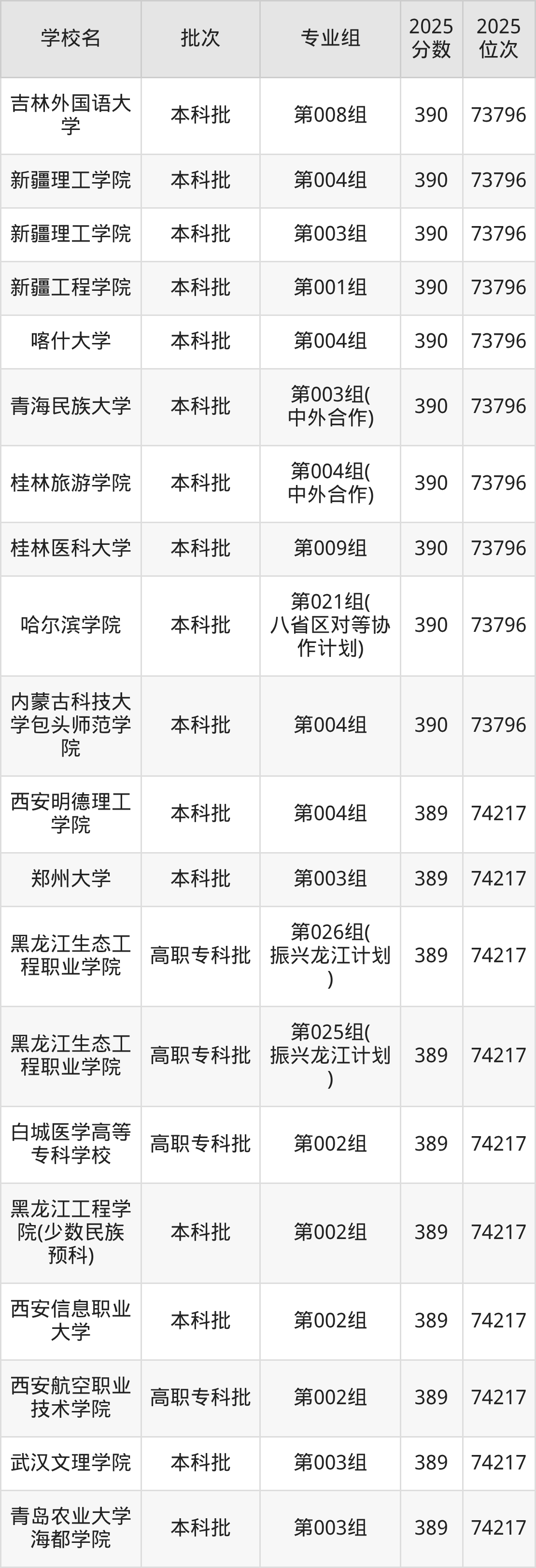 2025年黑龙江高考物理类389分(73797名~74217名)能上的大学有福建农林大学第004组、郑州大学第003组、玉林师范学院第002组、甘肃医学院第002组等。