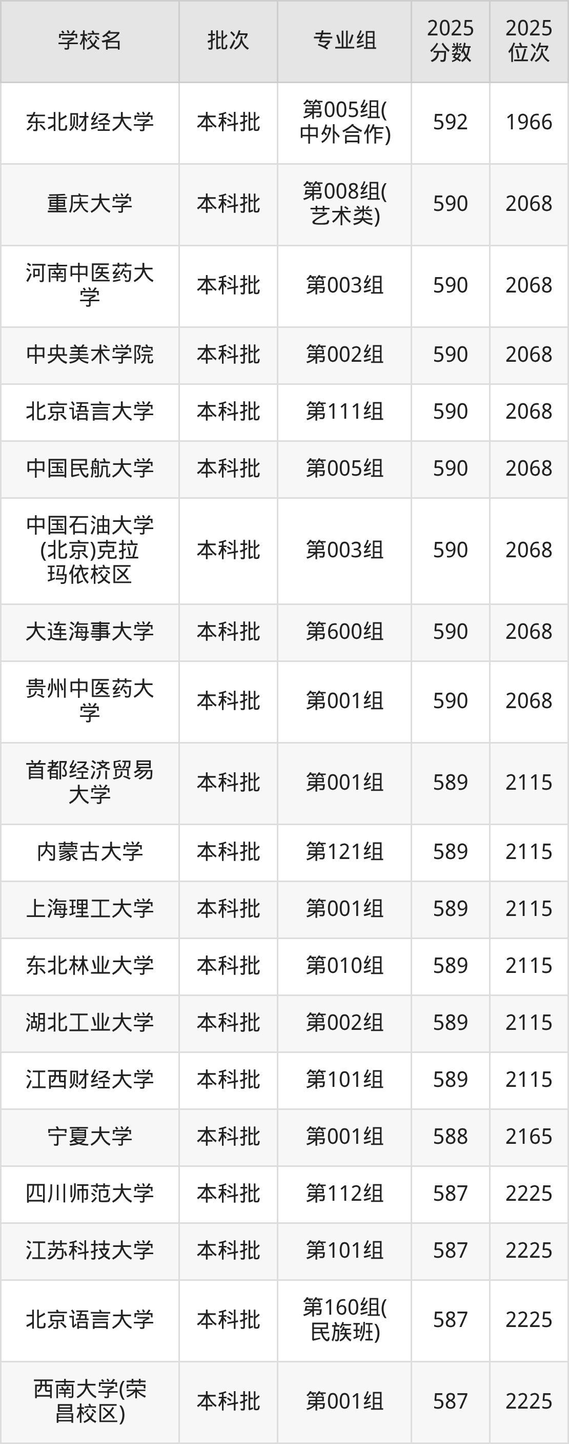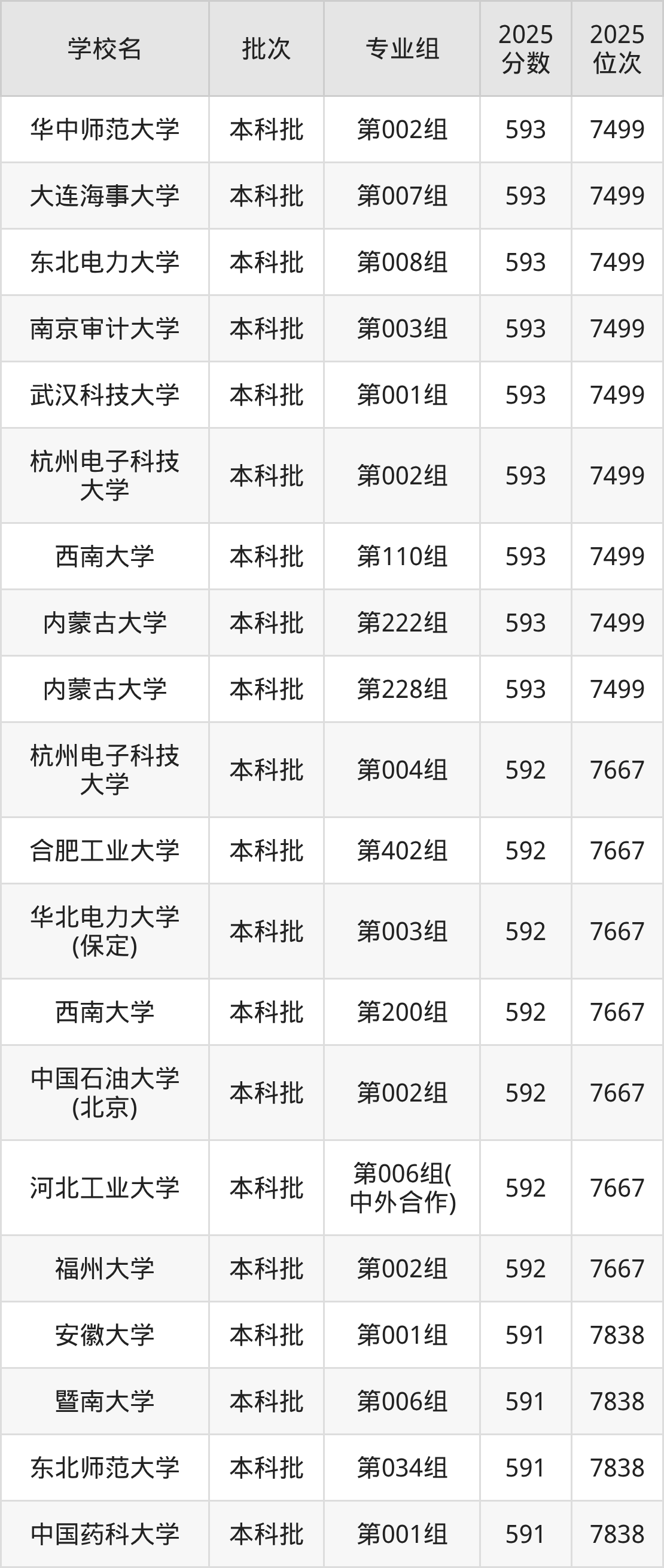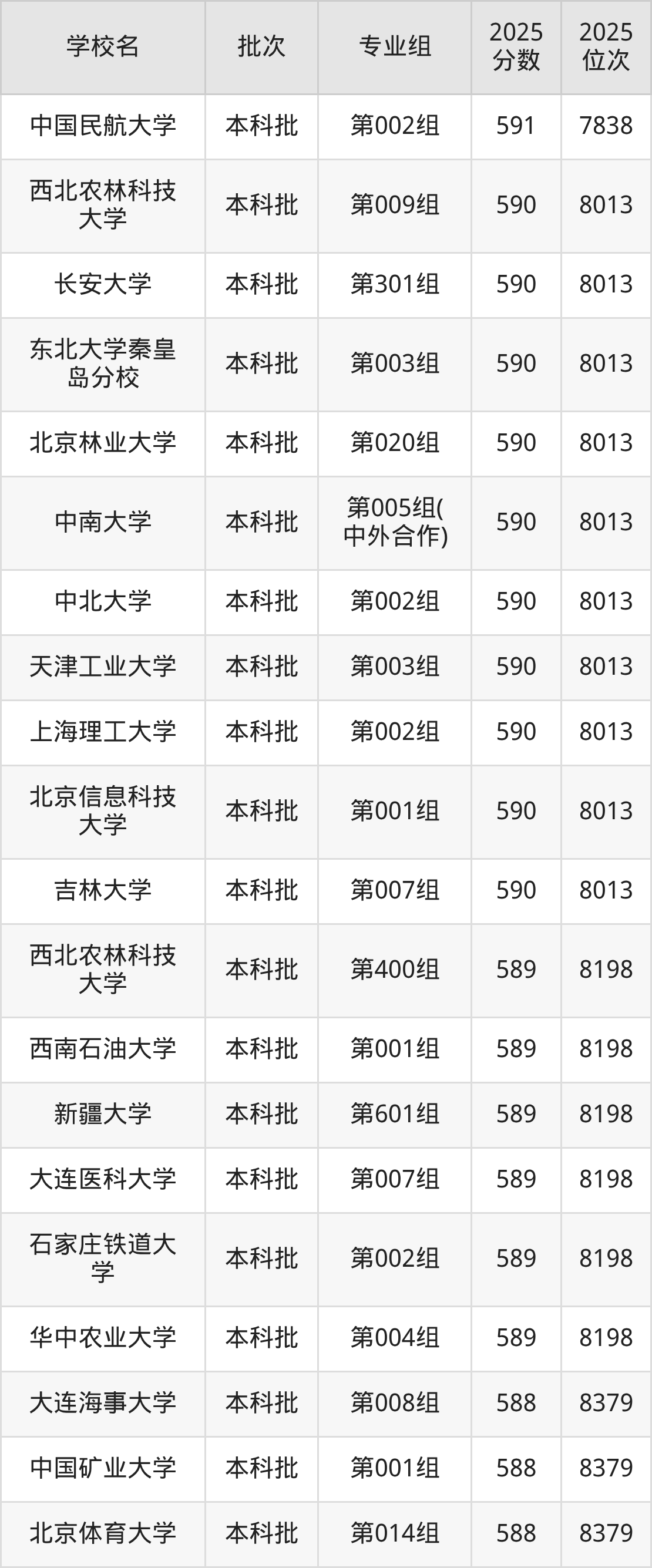 2025年内蒙古高考物理类590分(7839名~8013名)能上的大学有吉林大学第007组、西北农林科技大学第009组、北京信息科技大学第001组、上海理工大学第002组等。