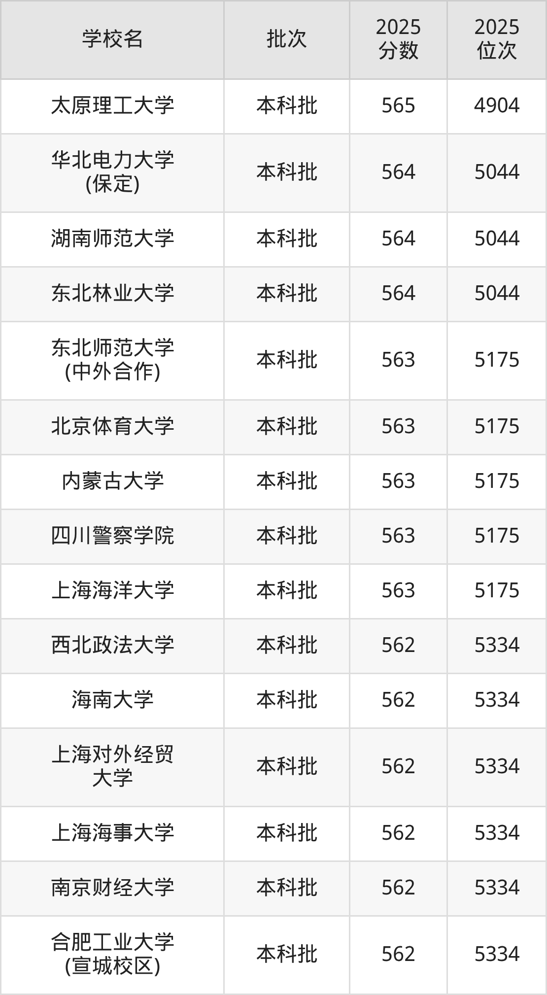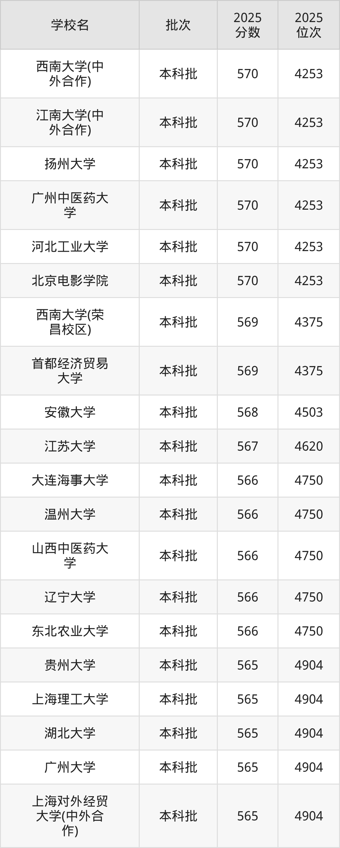 2025年重庆高考历史类565分(4751名~4904名)能上的大学有太原理工大学、上海对外经贸大学(中外合作)、广州大学、湖北大学等。