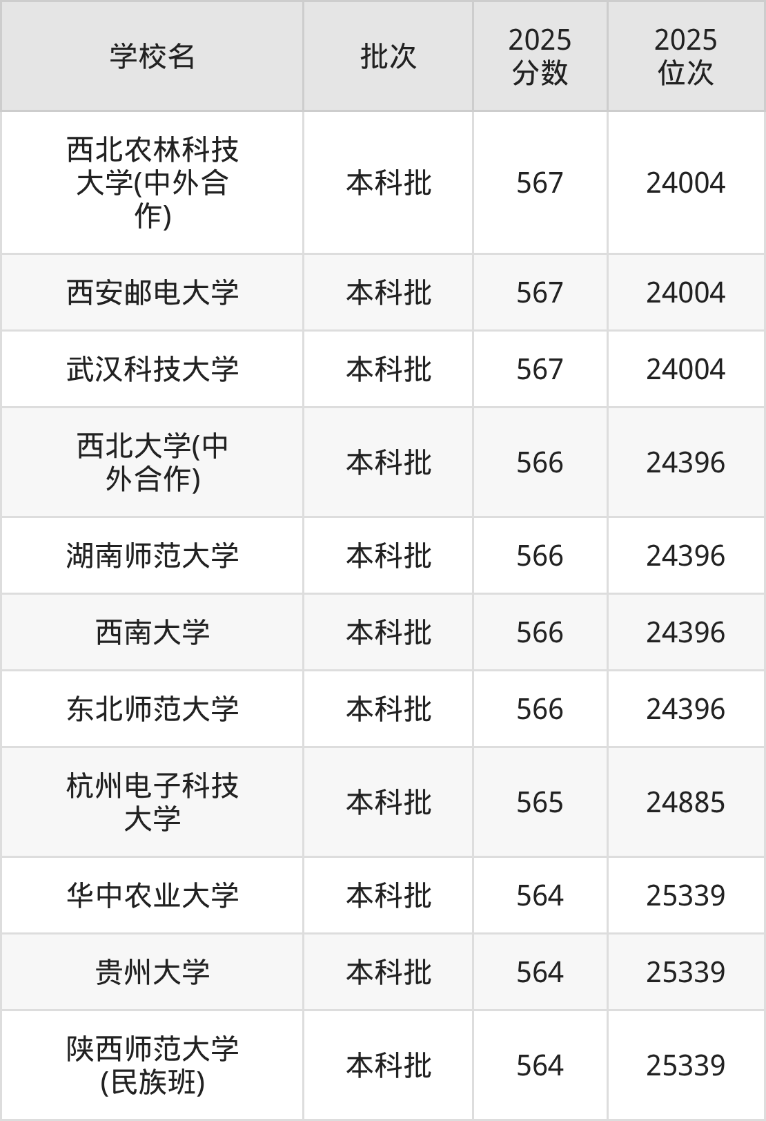 另外录取位次低于该区间(较稳妥)的有陕西师范大学(民族班)(25339名)、华中农业大学(25339名)等;录取位次高于该区间(可冲)的有西南大学(24396名)、东北师范大学(24396名)等。