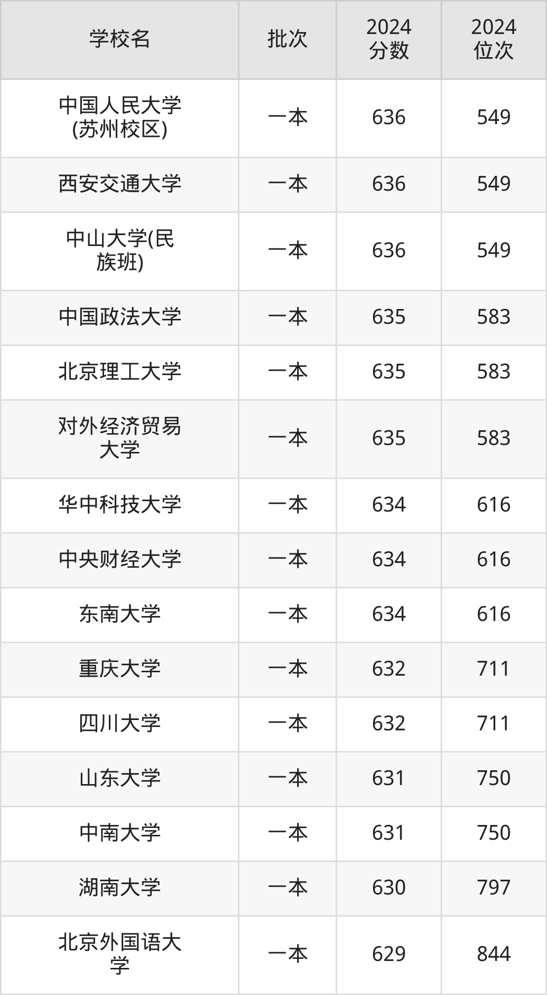 由于高考录取分数线历年波动较大,因此本文以该分数对应的位次排名为大家整理能上的大学名单。