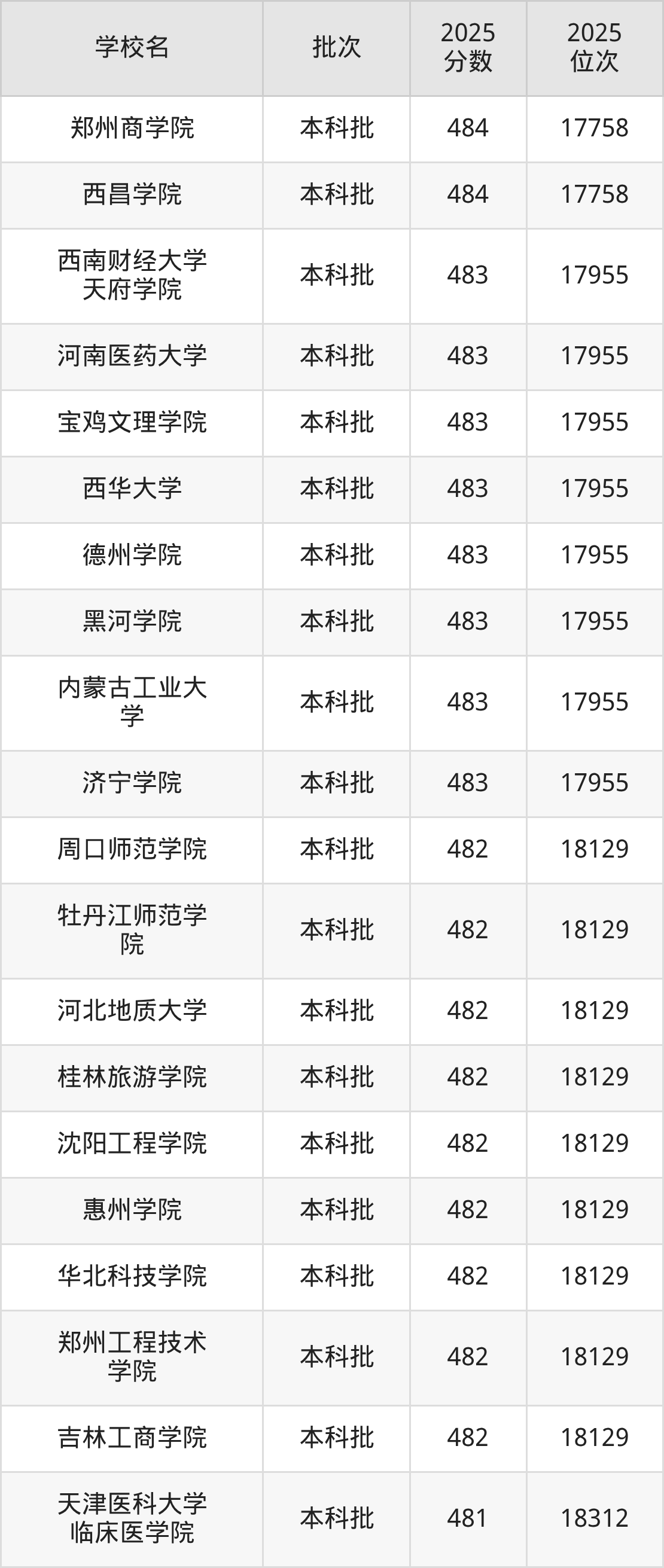 2025年辽宁高考历史类483分(17759名~17955名)能上的大学有济宁学院、西南财经大学天府学院、河南医药大学、内蒙古工业大学等。