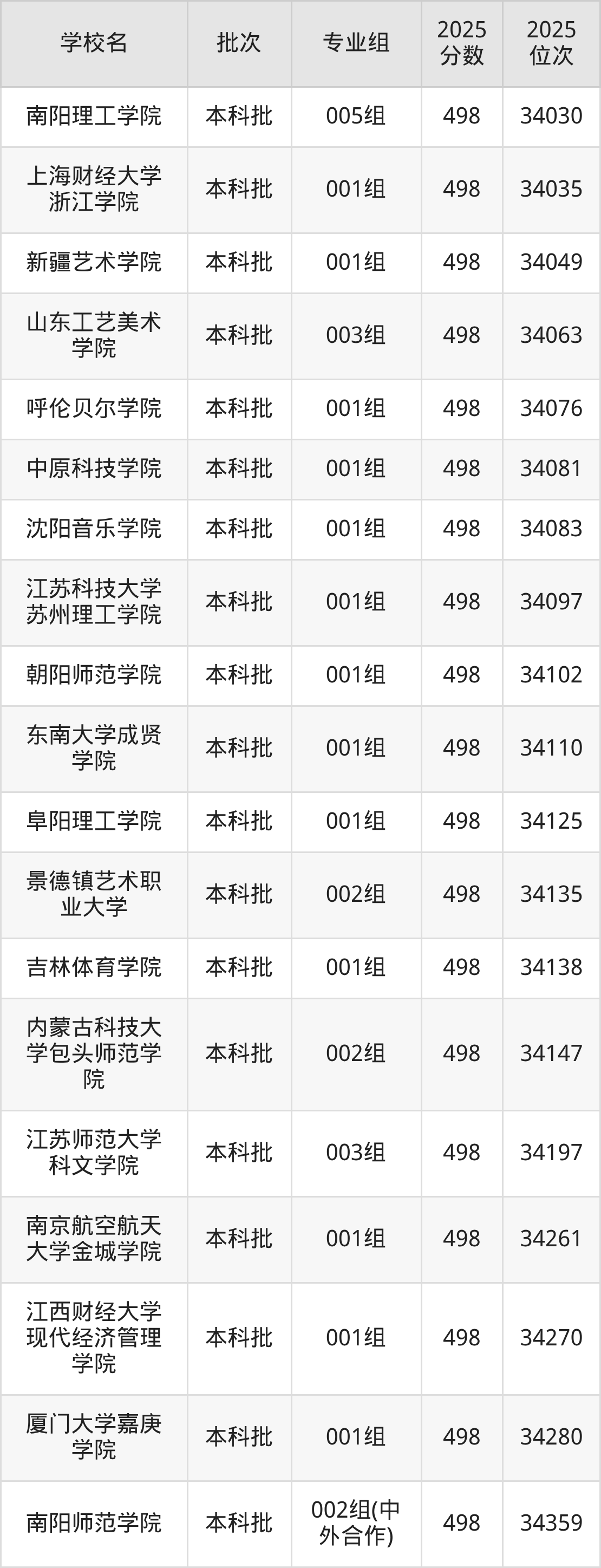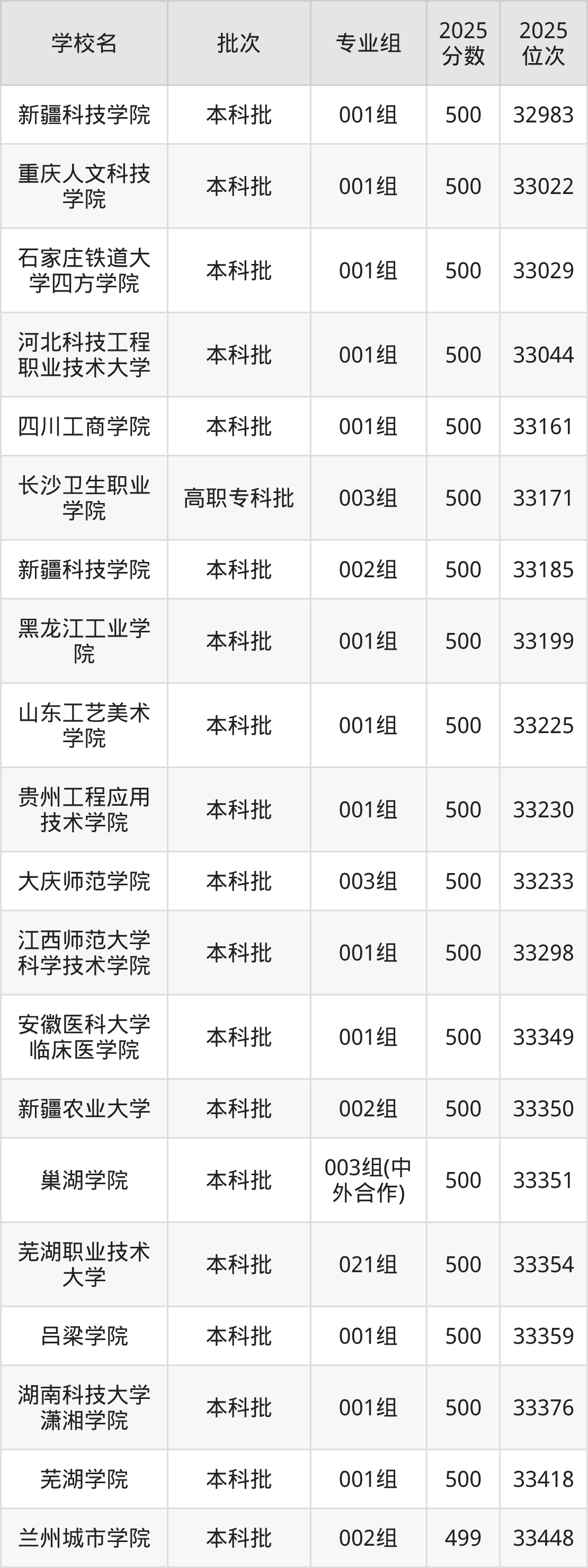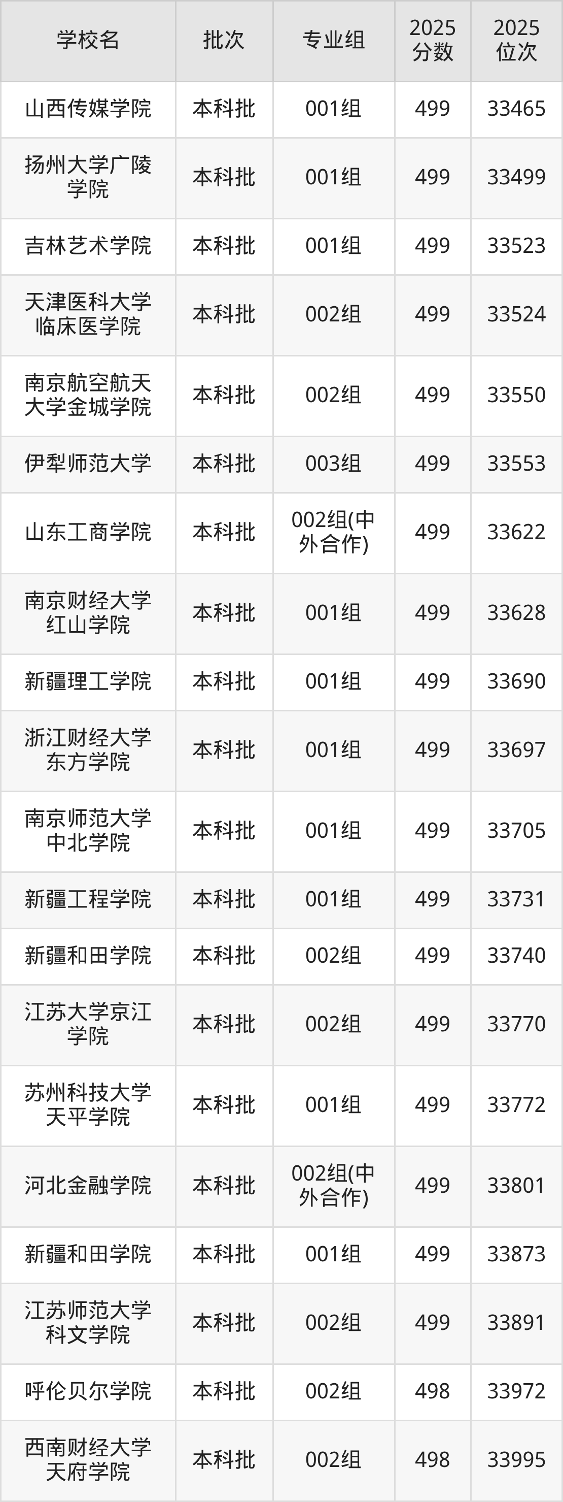2025年安徽高考历史类499分(33446名~33914名)能上的大学有河北金融学院002组(中外合作)、吉林艺术学院001组、兰州城市学院002组、山东工商学院002组(中外合作)等。