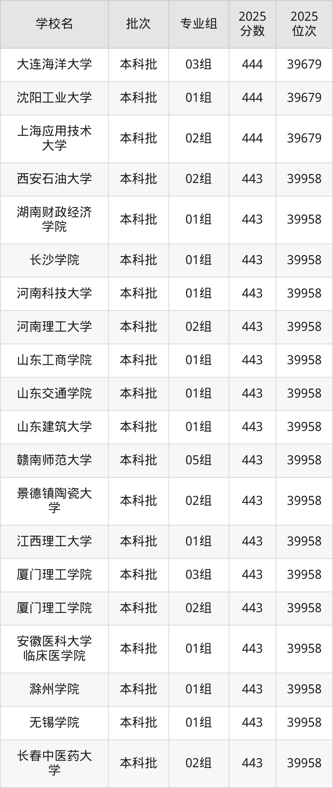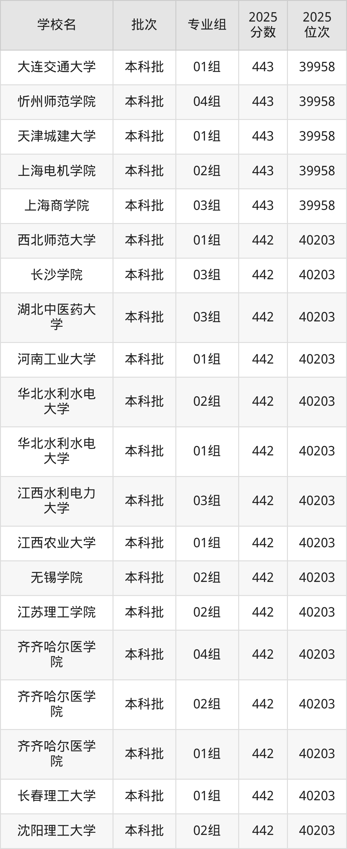 2025年上海高考443分(39680名~39958名)能上的大学有上海商学院03组、上海电机学院02组、天津城建大学01组、忻州师范学院04组等。