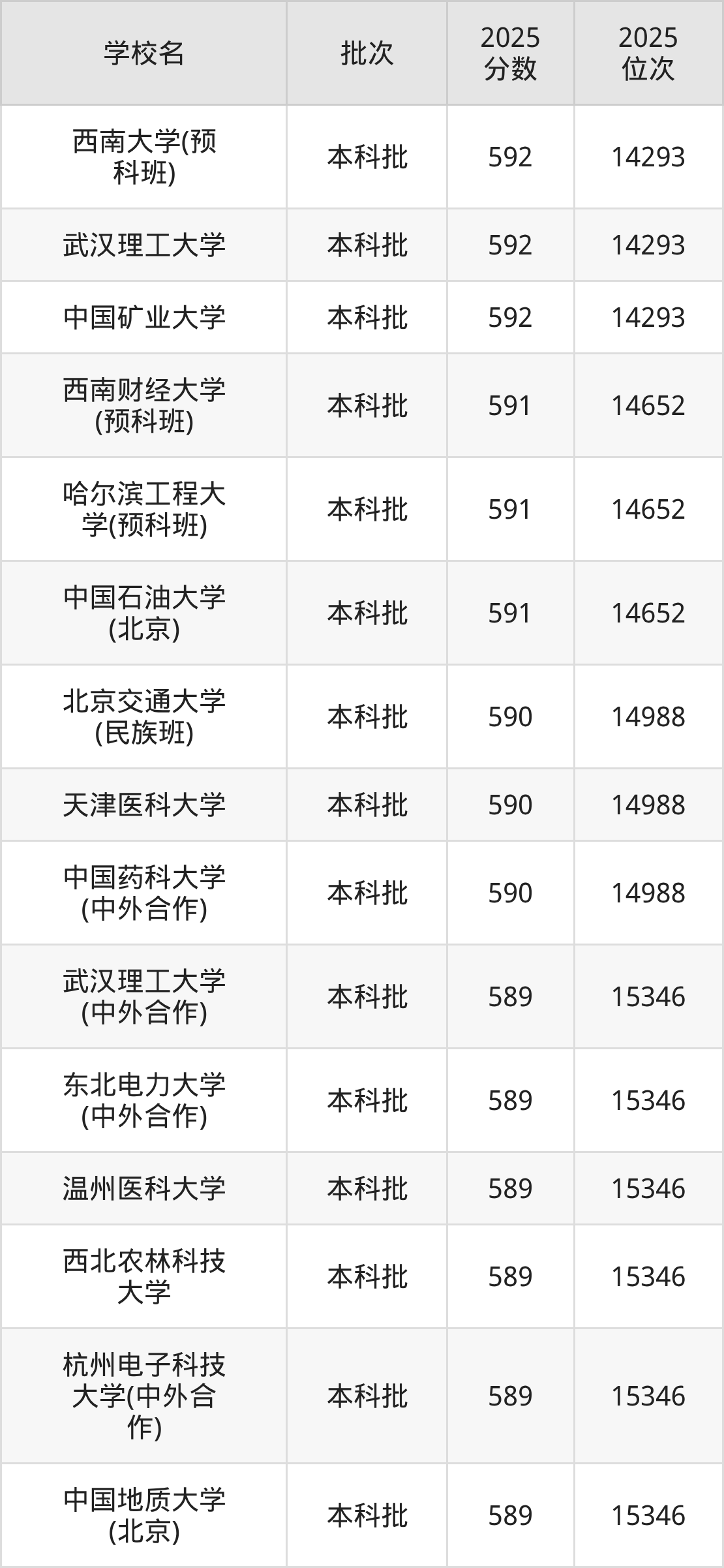 2025年重庆高考物理类590分(14653名~14988名)能上的大学有中国药科大学(中外合作)、天津医科大学、北京交通大学(民族班)。
