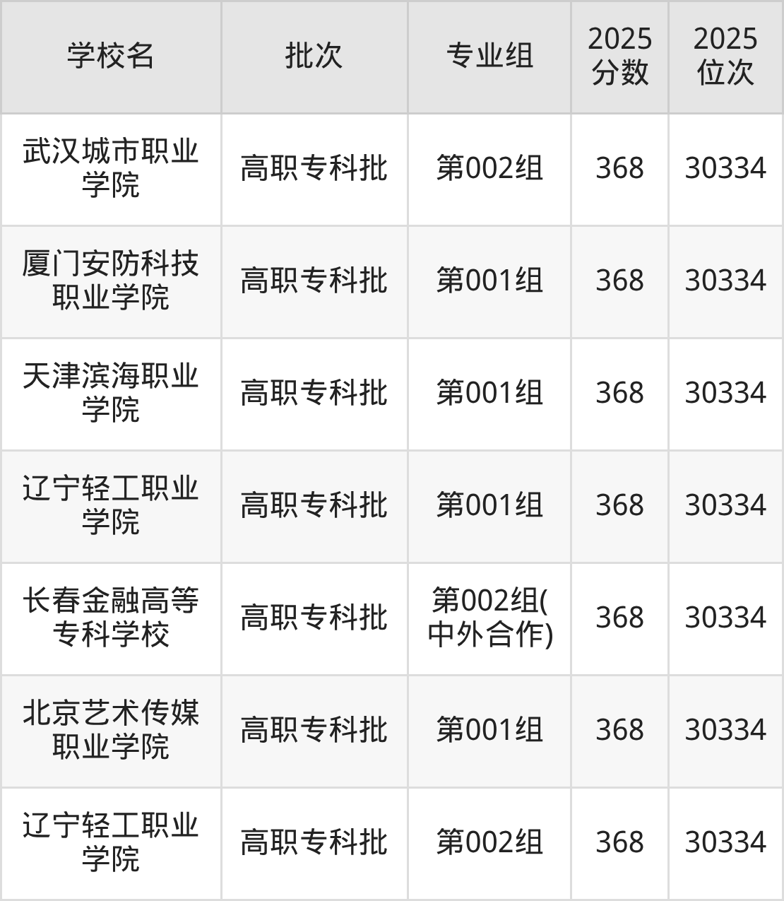另外录取位次低于该区间(较稳妥)的有江西师范高等专科学校第001组(30115名)、长春金融高等专科学校第001组(30115名)等;录取位次高于该区间(可冲)的有通辽职业学院第001组(29740名)、天津工业职业学院第001组(29518名)等。