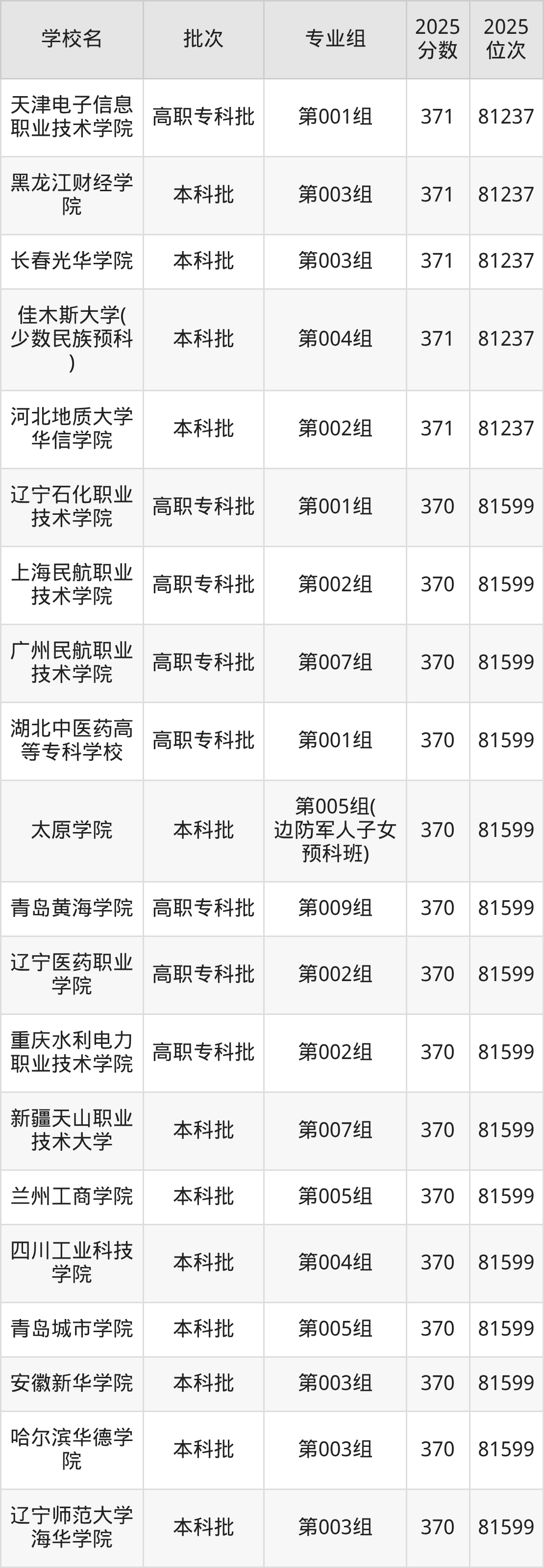 2025年黑龙江高考物理类370分(81238名~81599名)能上的大学有太原学院第005组(边防军人子女预科班)、辽宁师范大学海华学院第003组、哈尔滨华德学院第003组、安徽新华学院第003组等。