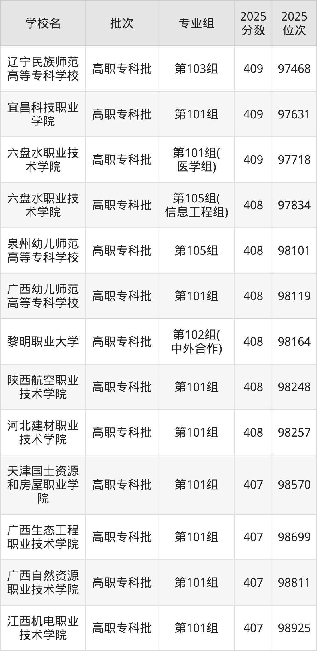 2025年江西高考历史类408分(97826名~98495名)能上的大学有广西幼儿师范高等专科学校第101组、六盘水职业技术学院第105组(信息工程组)、泉州幼儿师范高等专科学校第105组、河北建材职业技术学院第101组等。