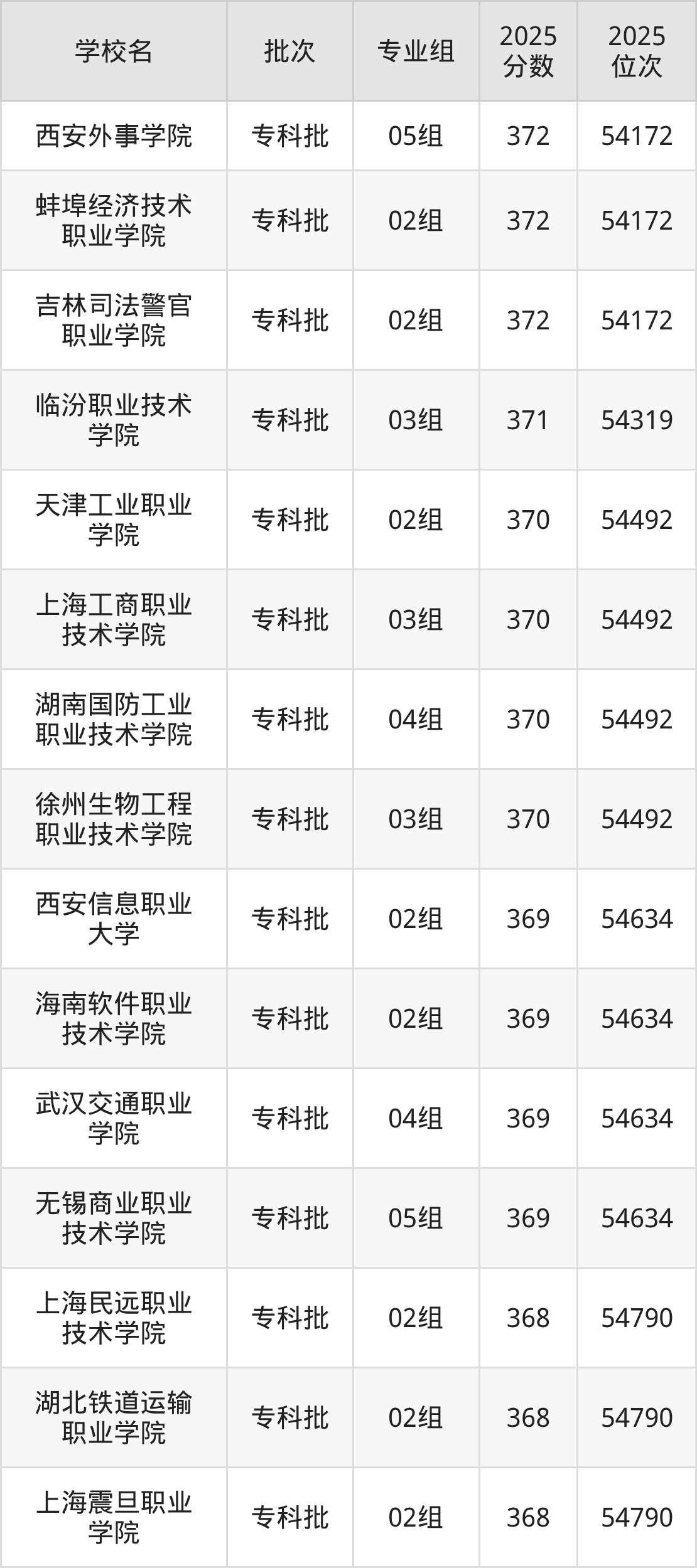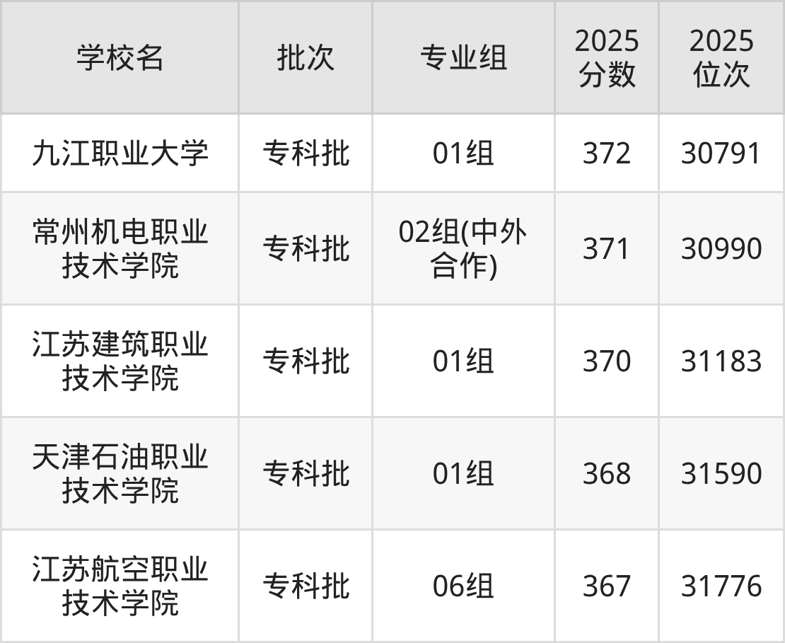 2025年江苏高考物理类369分(54493名~54634名)能上的大学有无锡商业职业技术学院05组、武汉交通职业学院04组、海南软件职业技术学院02组、西安信息职业大学02组。