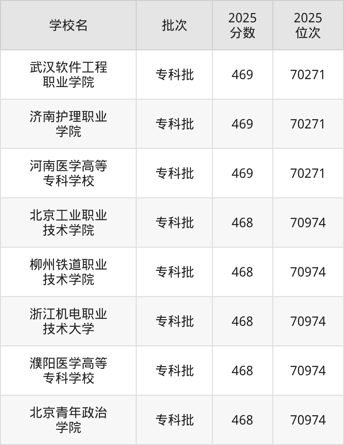 2025年河北高考历史类468分(70272名~70974名)能上的大学有北京青年政治学院、北京工业职业技术学院、濮阳医学高等专科学校、浙江机电职业技术大学等。