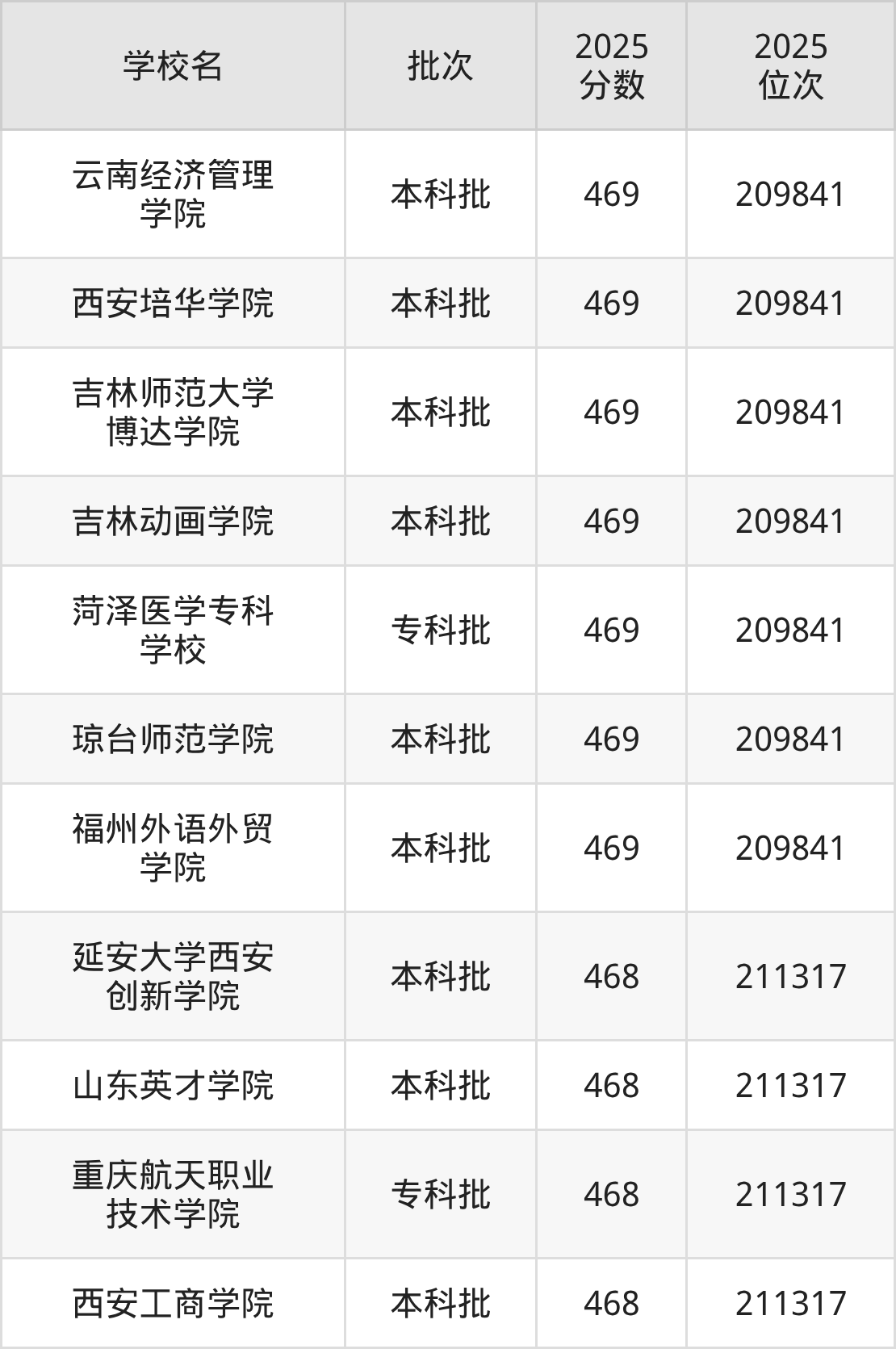 2025年河北高考物理类468分(209842名~211317名)能上的大学有山东英才学院、重庆航天职业技术学院、延安大学西安创新学院、西安工商学院。