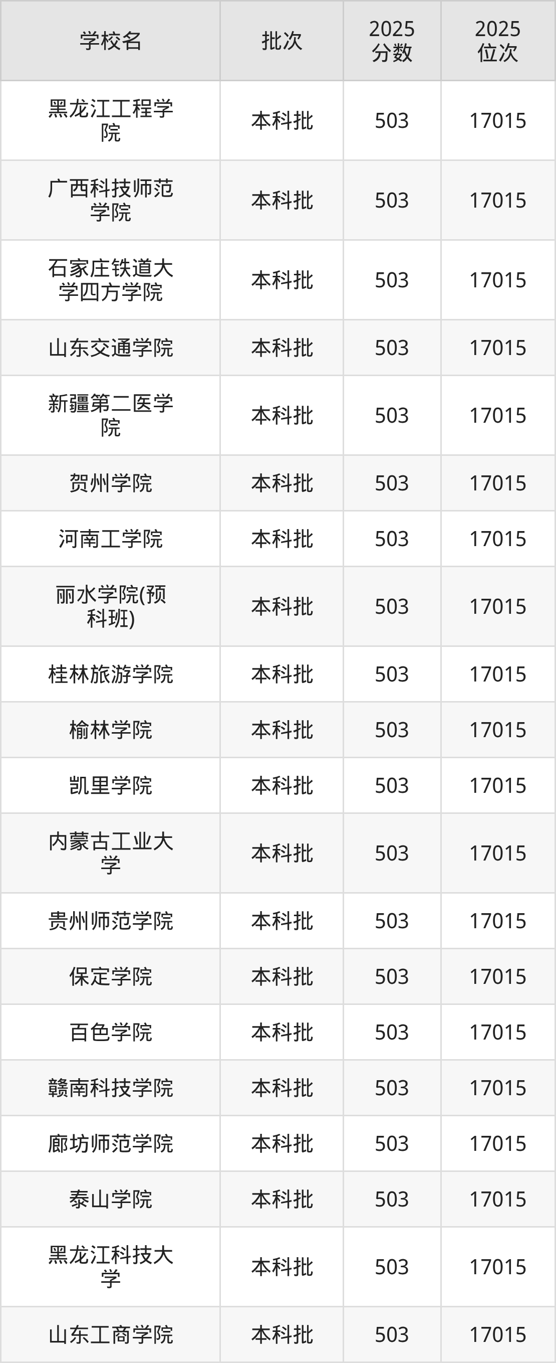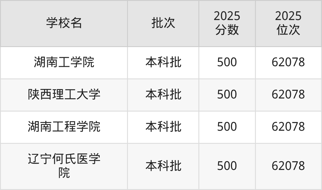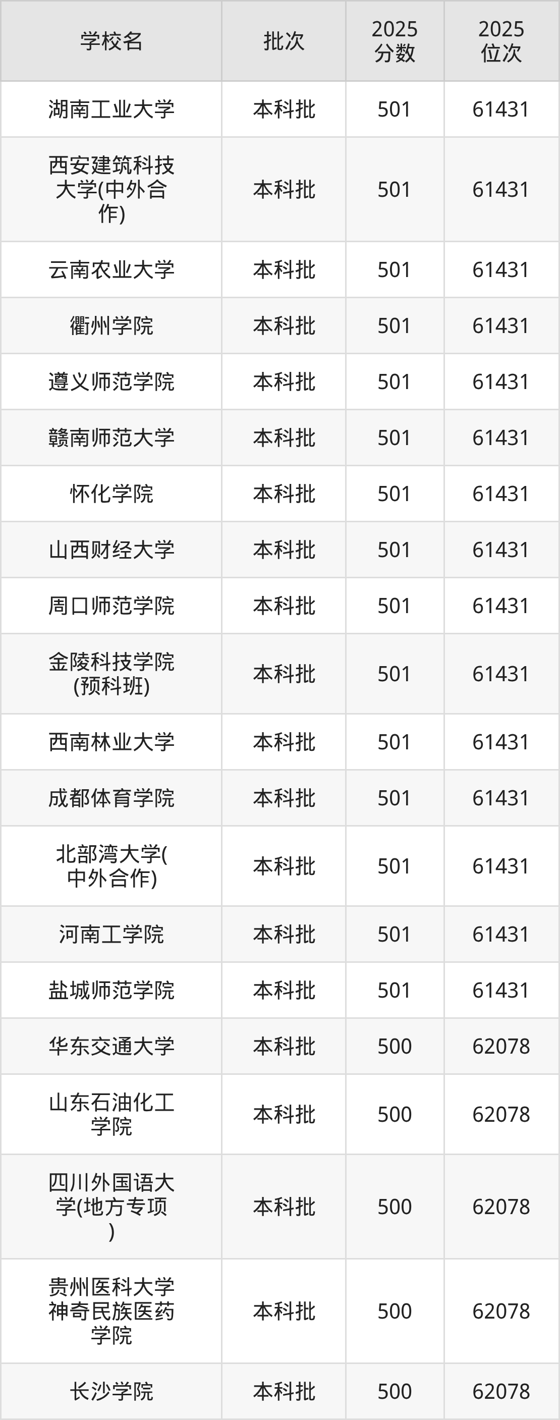2025年重庆高考物理类500分(61432名~62078名)能上的大学有山东石油化工学院、辽宁何氏医学院、湖南工程学院、陕西理工大学等。