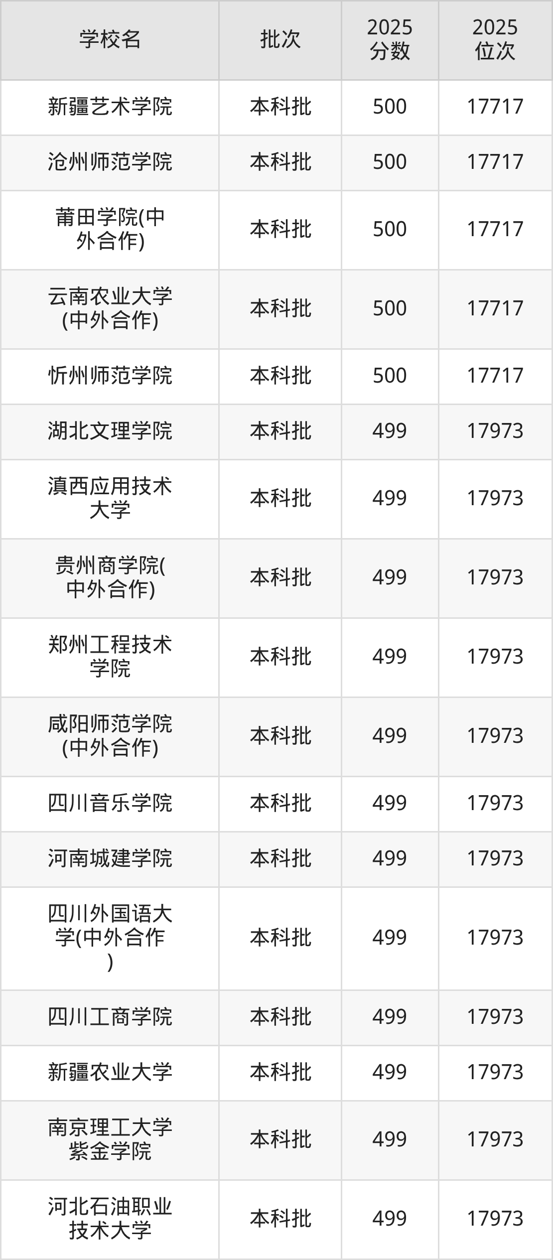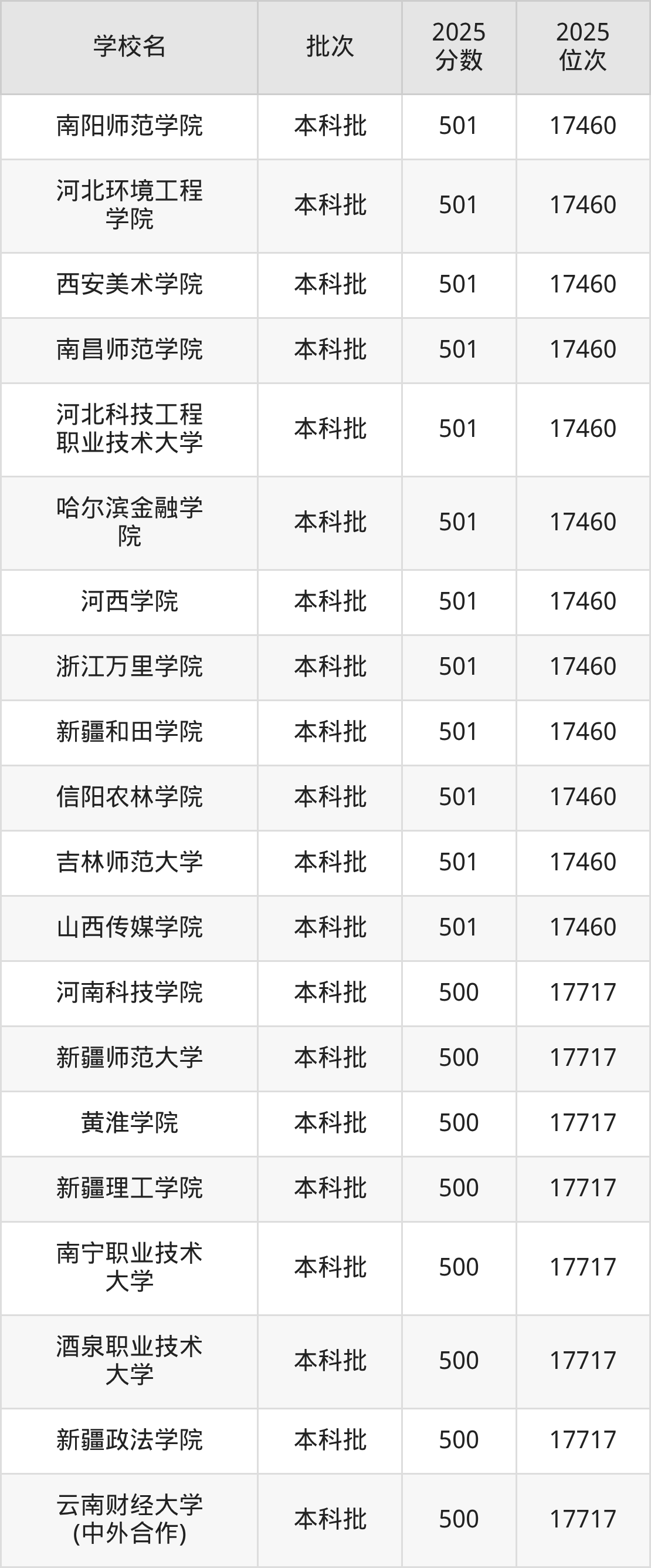 2025年重庆高考历史类500分(17461名~17717名)能上的大学有黄淮学院、新疆艺术学院、莆田学院(中外合作)、酒泉职业技术大学等。