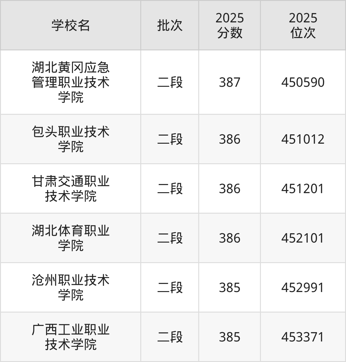 2025年山东高考386分(450896名~452914名)能上的大学有包头职业技术学院、甘肃交通职业技术学院、湖北体育职业学院。