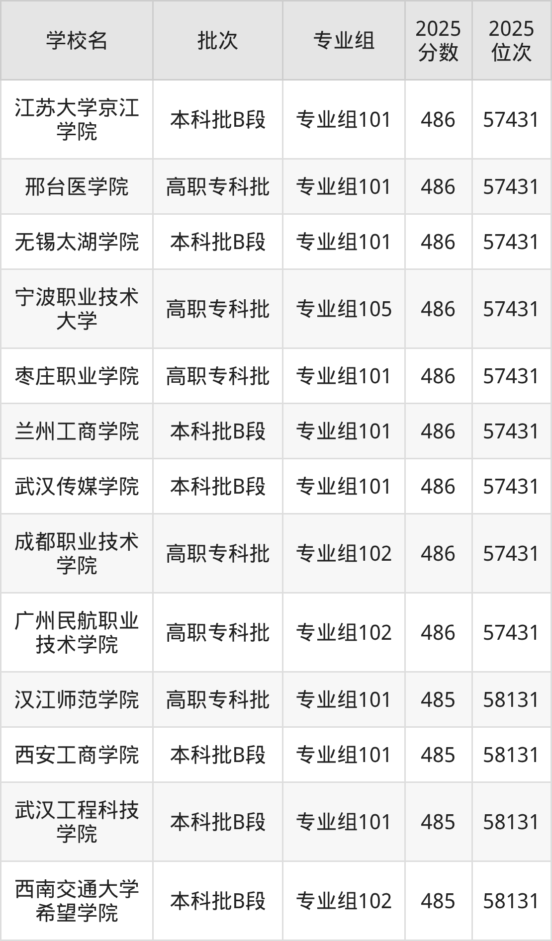 2025年四川高考历史类485分(57432名~58131名)能上的大学有汉江师范学院专业组101、西安工商学院专业组101、武汉工程科技学院专业组101、西南交通大学希望学院专业组102。