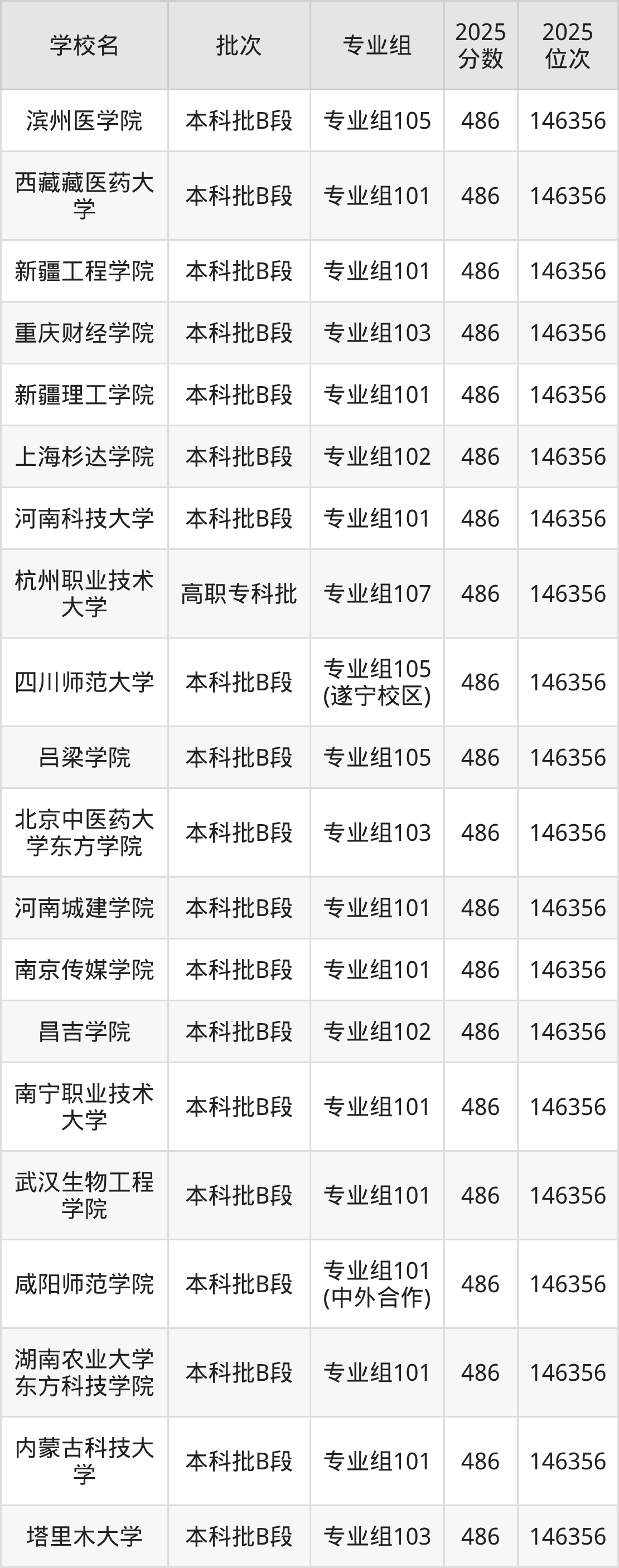 另外录取位次低于该区间(较稳妥)的有福建中医药大学专业组101(149186名)、河北工程大学科信学院专业组101(149186名)等;录取位次高于该区间(可冲)的有滨州医学院专业组105(146356名)、武汉生物工程学院专业组101(146356名)等。