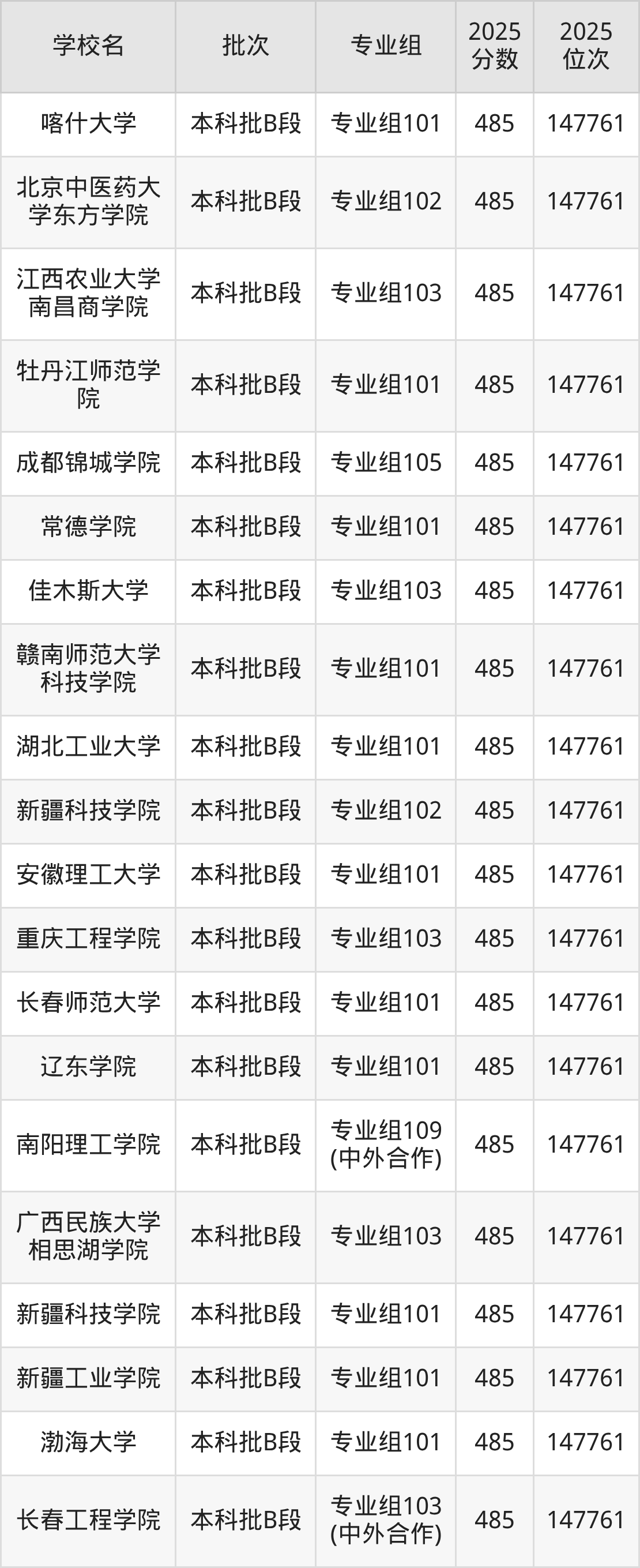 2025年四川高考物理类485分(146357名~147761名)能上的大学有安徽理工大学专业组101、新疆科技学院专业组102、湖北工业大学专业组101、赣南师范大学科技学院专业组101等。