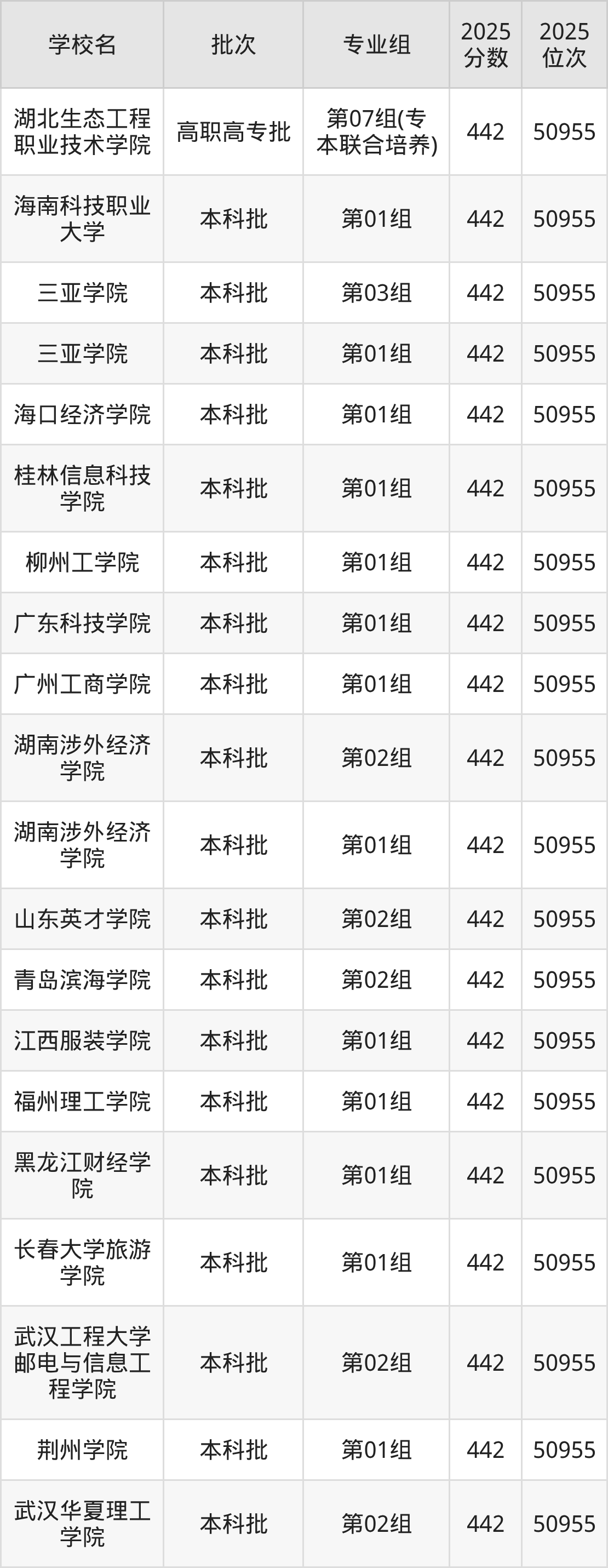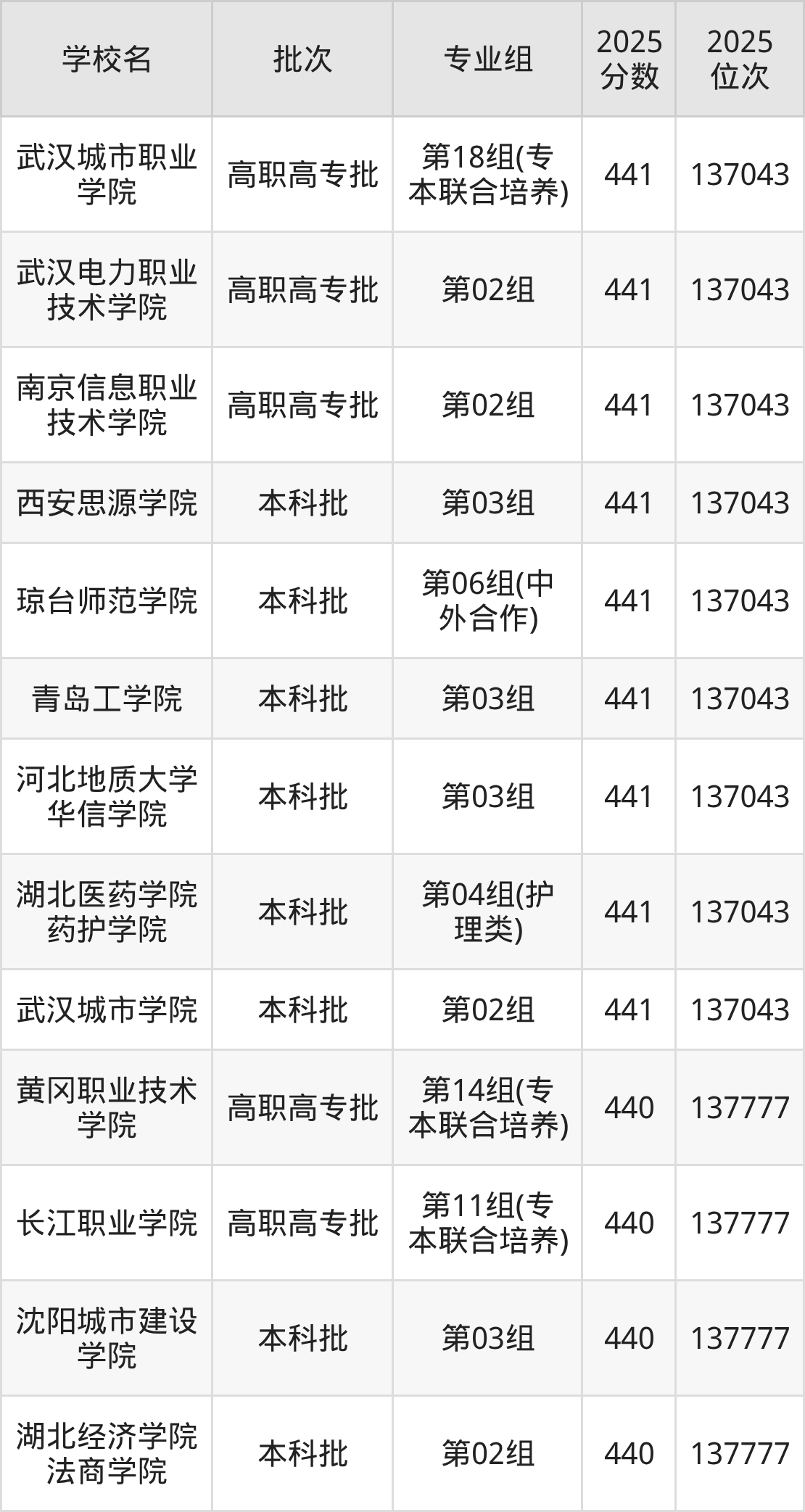 2025年湖北高考物理类440分(137044名~137777名)能上的大学有湖北经济学院法商学院第02组、沈阳城市建设学院第03组、长江职业学院第11组(专本联合培养)、黄冈职业技术学院第14组(专本联合培养)。