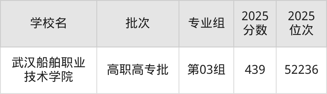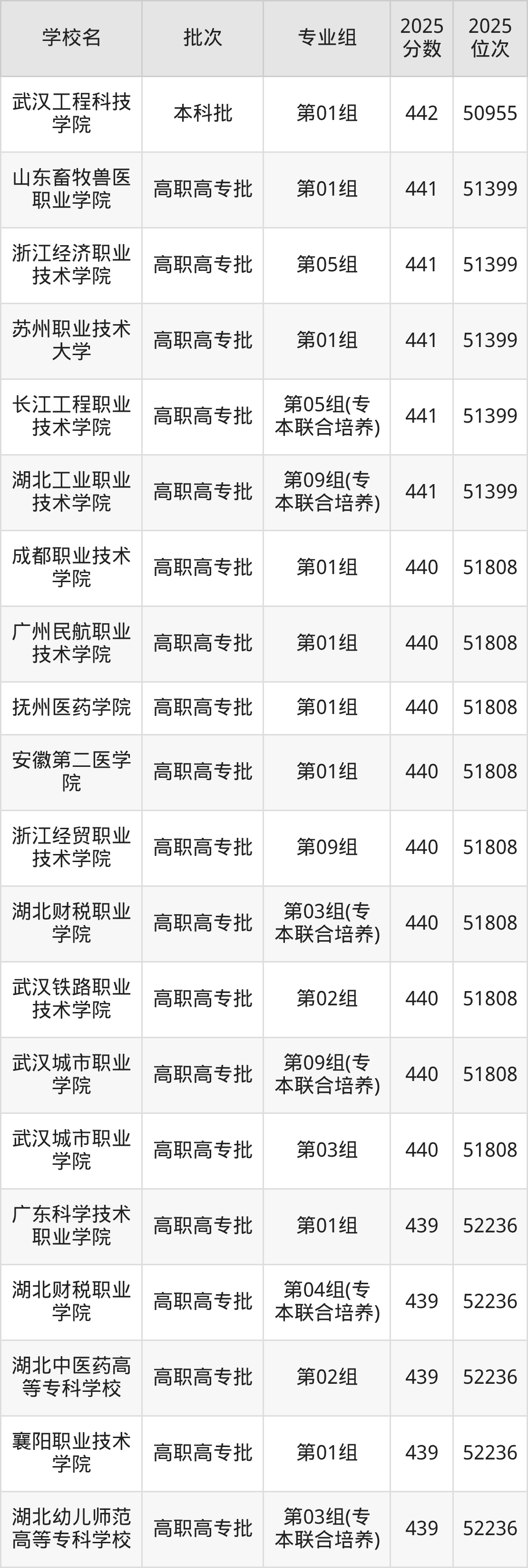 2025年湖北高考历史类440分(51400名~51808名)能上的大学有武汉城市职业学院第03组、武汉城市职业学院第09组(专本联合培养)、武汉铁路职业技术学院第02组、湖北财税职业学院第03组(专本联合培养)等。