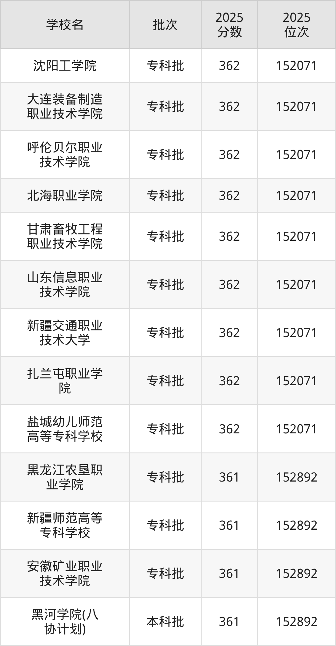 2025年河北高考历史类361分(152072名~152892名)能上的大学有安徽矿业职业技术学院、黑龙江农垦职业学院、黑河学院(八协计划)、新疆师范高等专科学校。