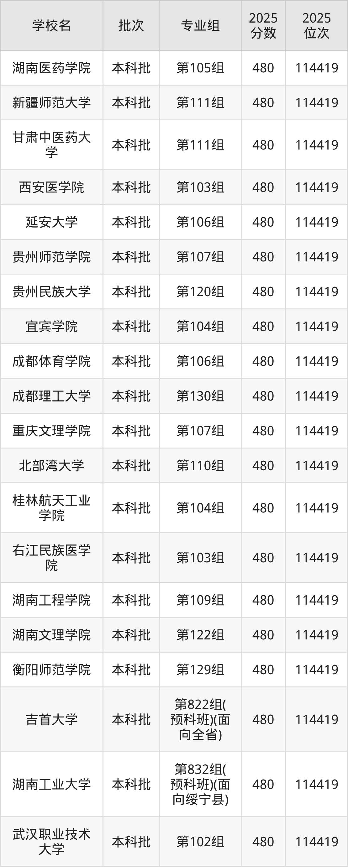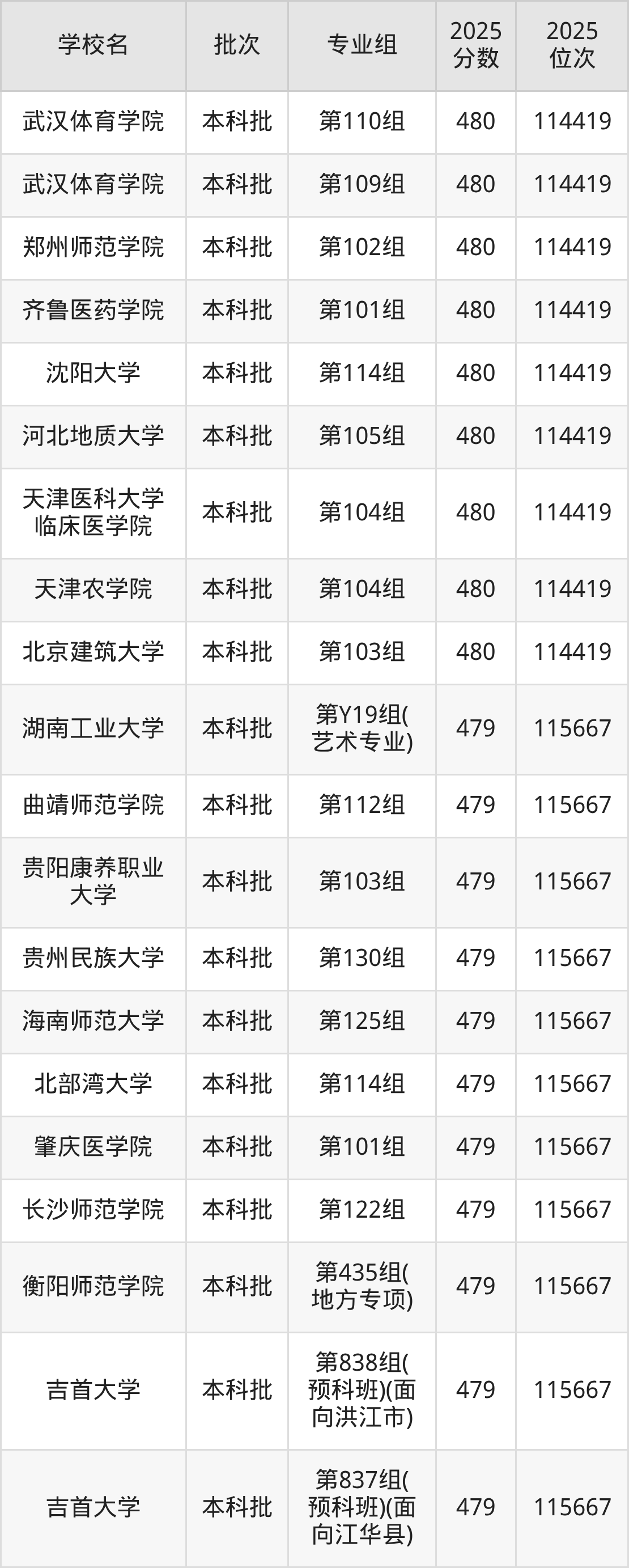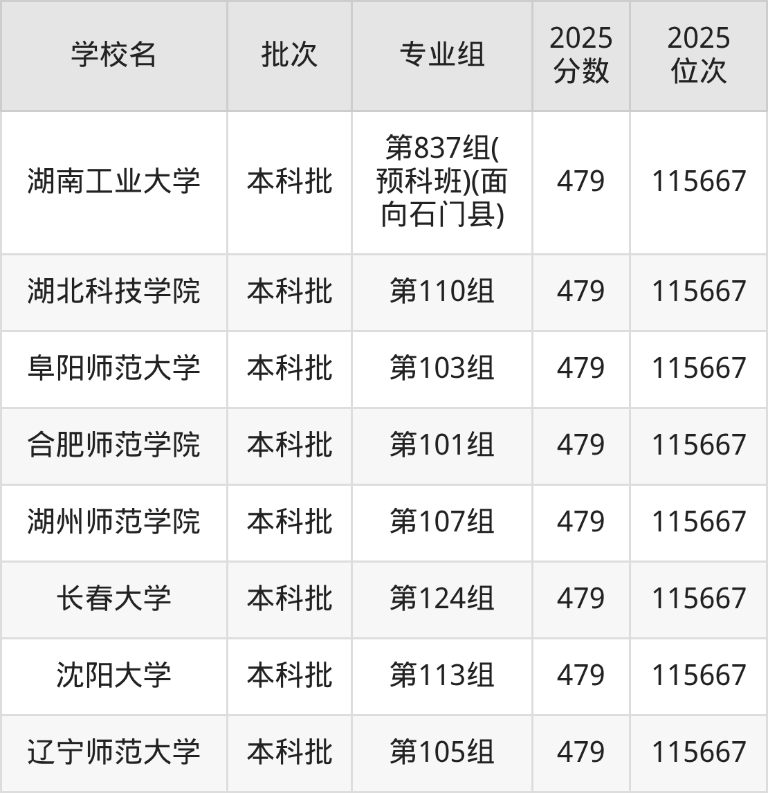 2025年湖南高考物理类479分(114420名~115667名)能上的大学有辽宁师范大学第105组、沈阳大学第113组、长春大学第124组、湖州师范学院第107组等。