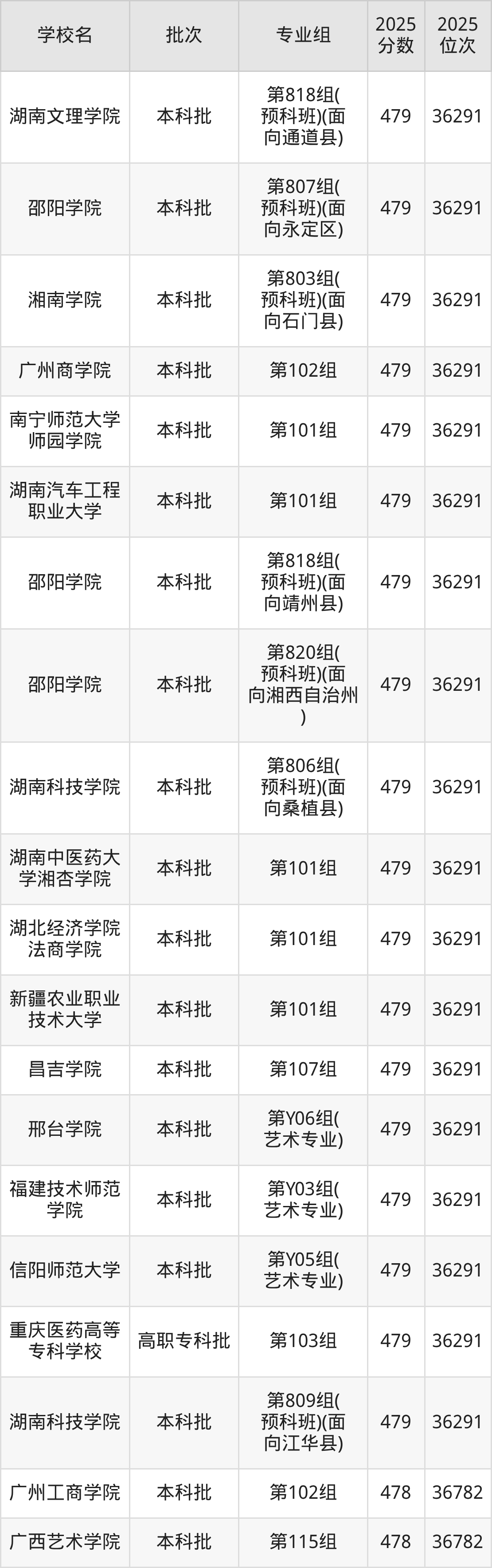 湖南高考479分:历史类排名36291位、物理类排名115667位。该分数位次对应能上的大学历史类有内蒙古科技大学包头师范学院第105组、朝阳师范学院第101组;物理类有辽宁师范大学第105组、沈阳大学第113组,更多名单如下文所示,2026届考生可参考。