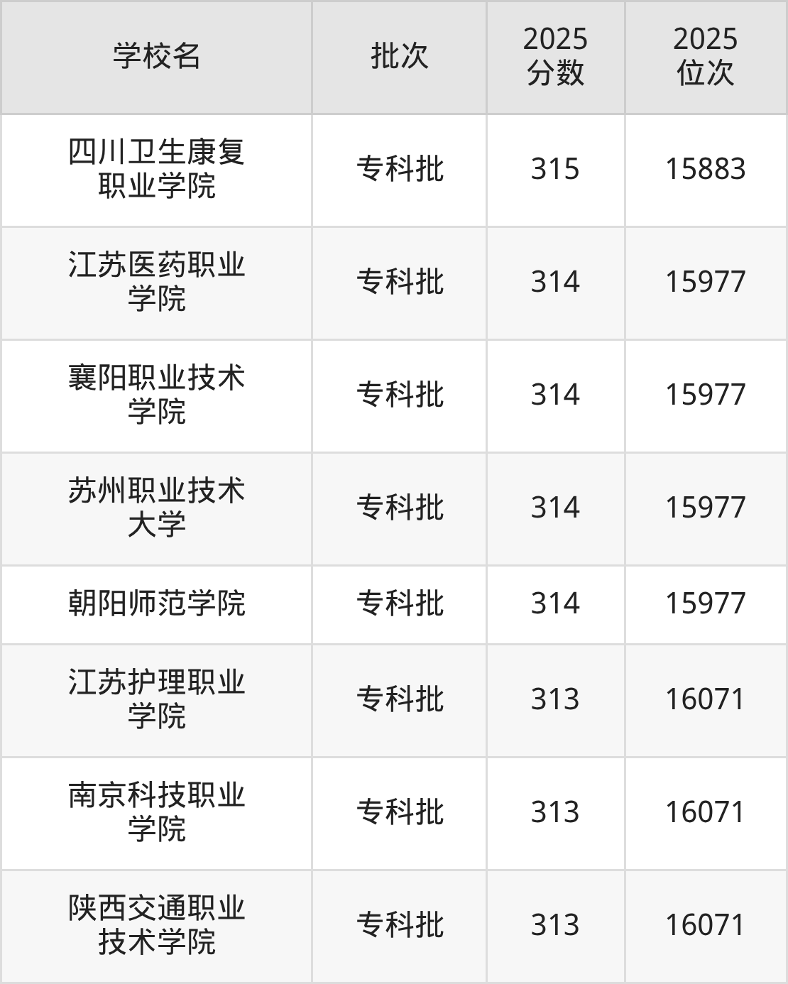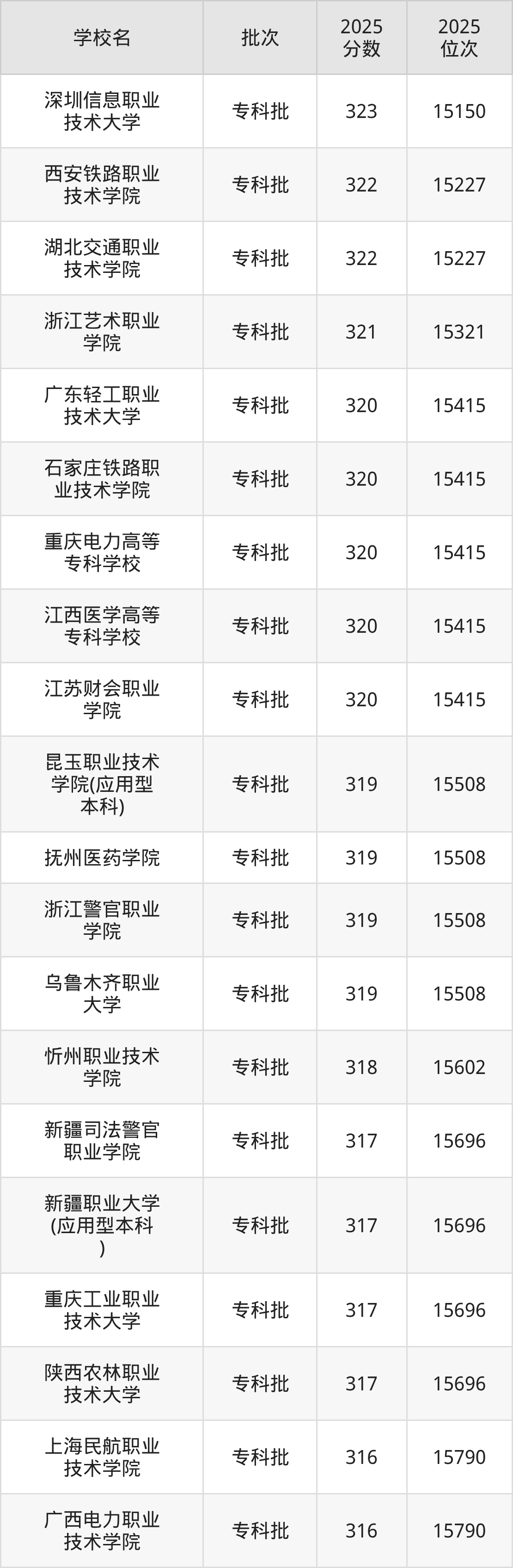 2025年新疆高考文科317分(15603名~15696名)能上的大学有陕西农林职业技术大学、重庆工业职业技术大学、新疆司法警官职业学院、新疆职业大学(应用型本科)。