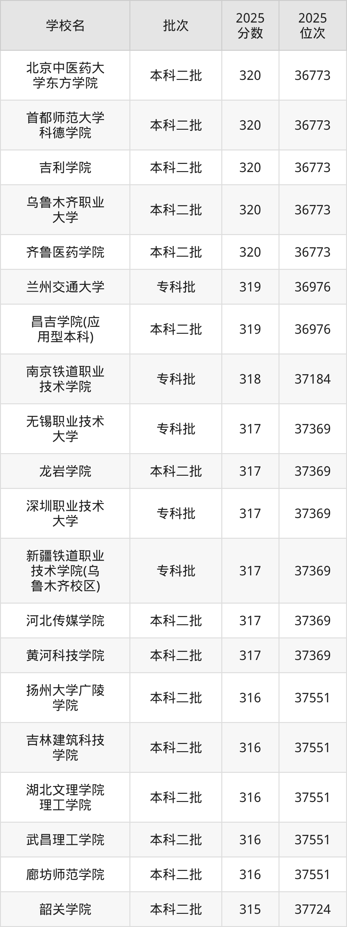 这些都是2026年高考理科37185名~37369名考生可以报考的大学,更多学校名单如下表所示: