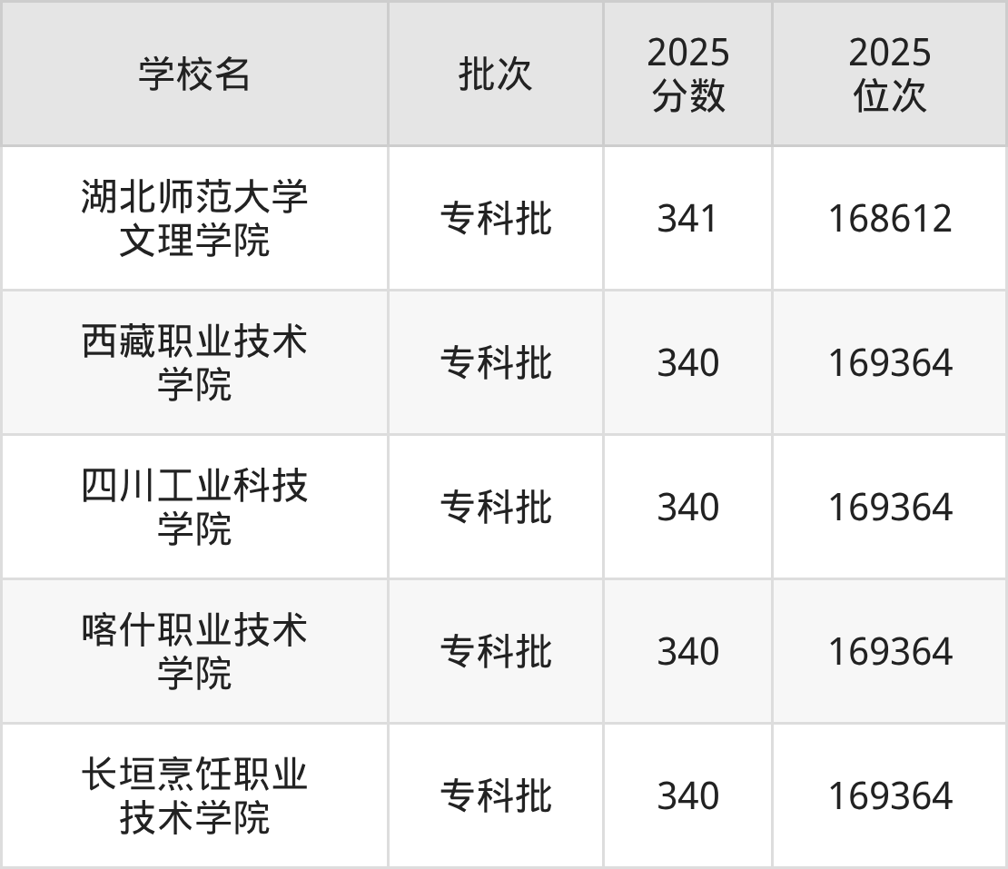 2025年河北高考历史类340分(168613名~169364名)能上的大学有长垣烹饪职业技术学院、喀什职业技术学院、四川工业科技学院、西藏职业技术学院。