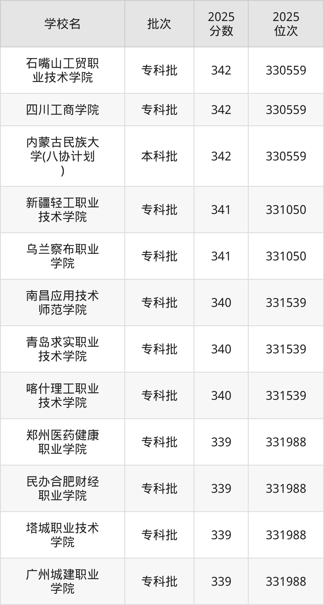 另外录取位次低于该区间(较稳妥)的有塔城职业技术学院(331988名)、广州城建职业学院(331988名)等;录取位次高于该区间(可冲)的有新疆轻工职业技术学院(331050名)、乌兰察布职业学院(331050名)等。