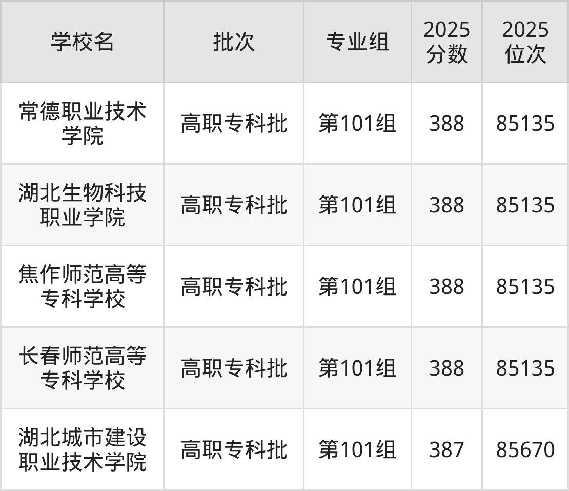 2025年湖南高考历史类387分(85136名~85670名)能上的大学有湖北城市建设职业技术学院第101组。