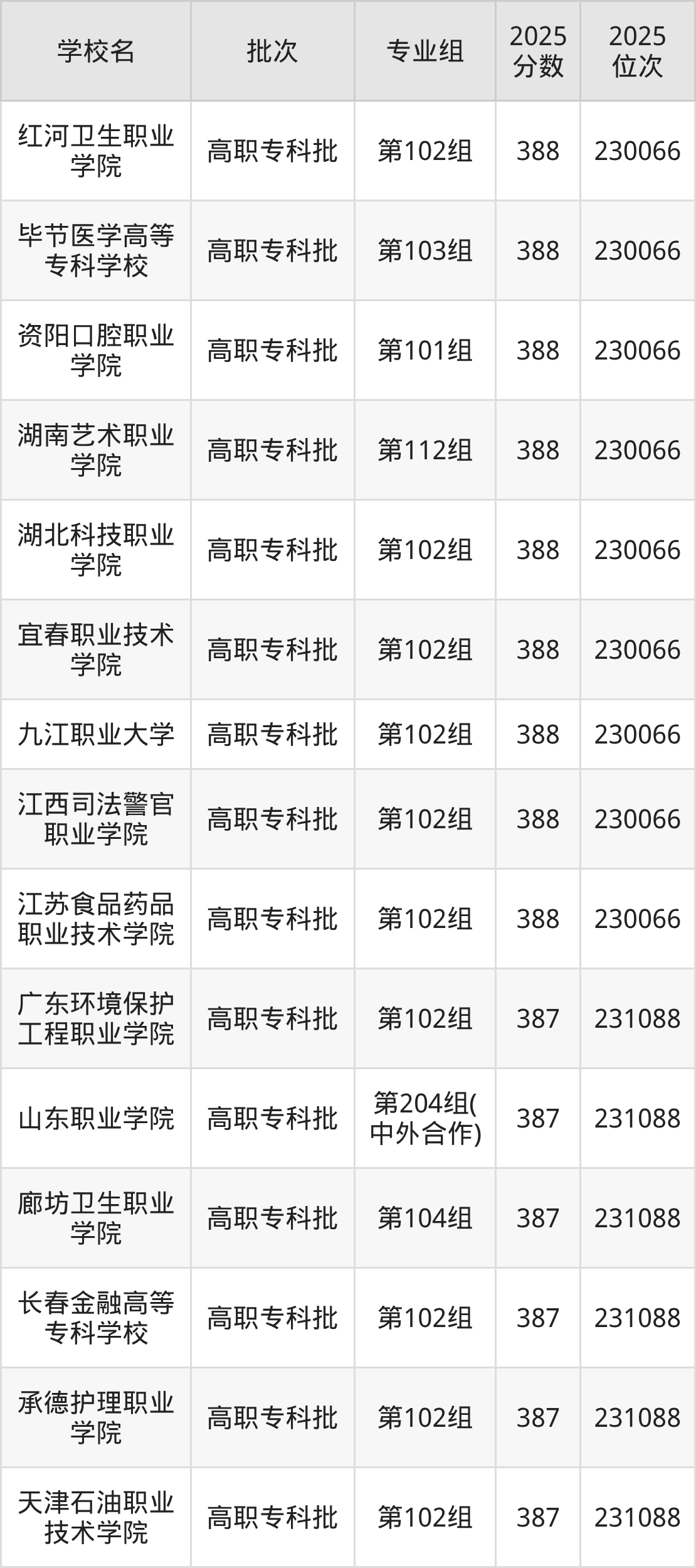 2025年湖南高考物理类387分(230067名~231088名)能上的大学有天津石油职业技术学院第102组、承德护理职业学院第102组、长春金融高等专科学校第102组、廊坊卫生职业学院第104组等。