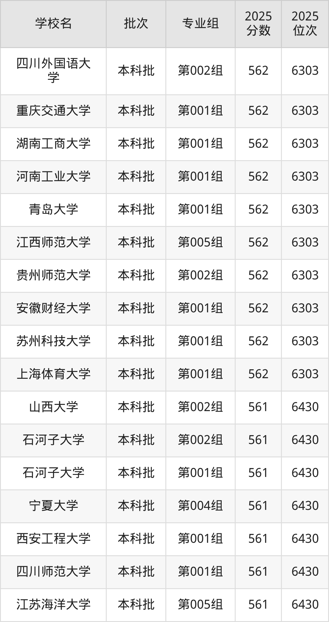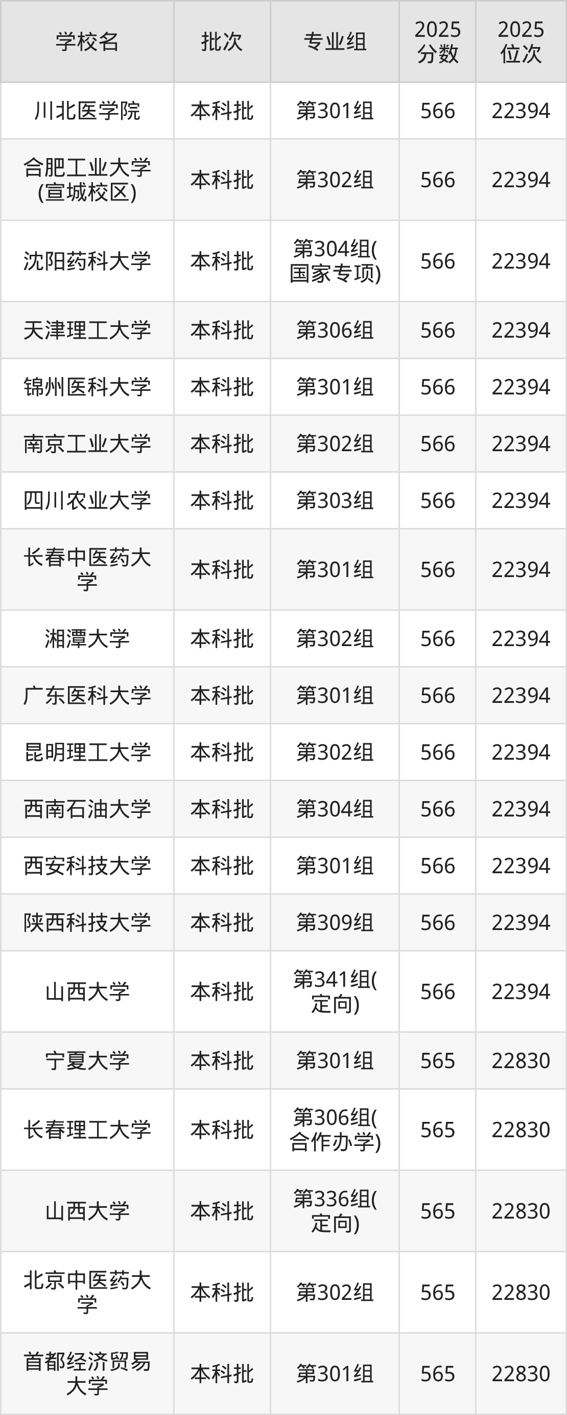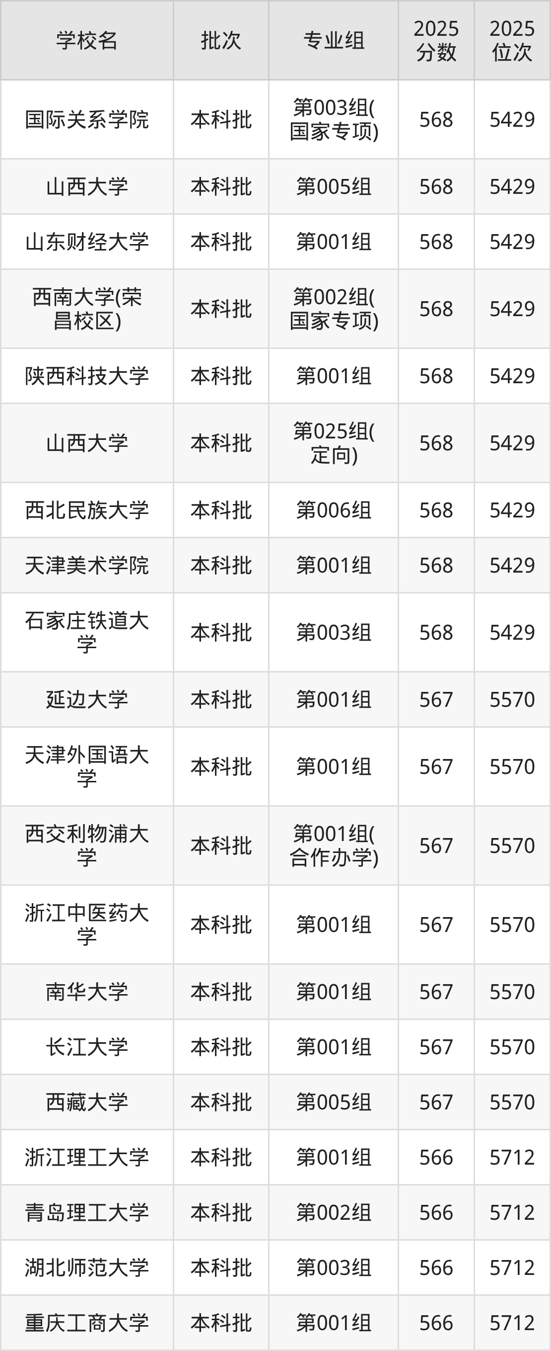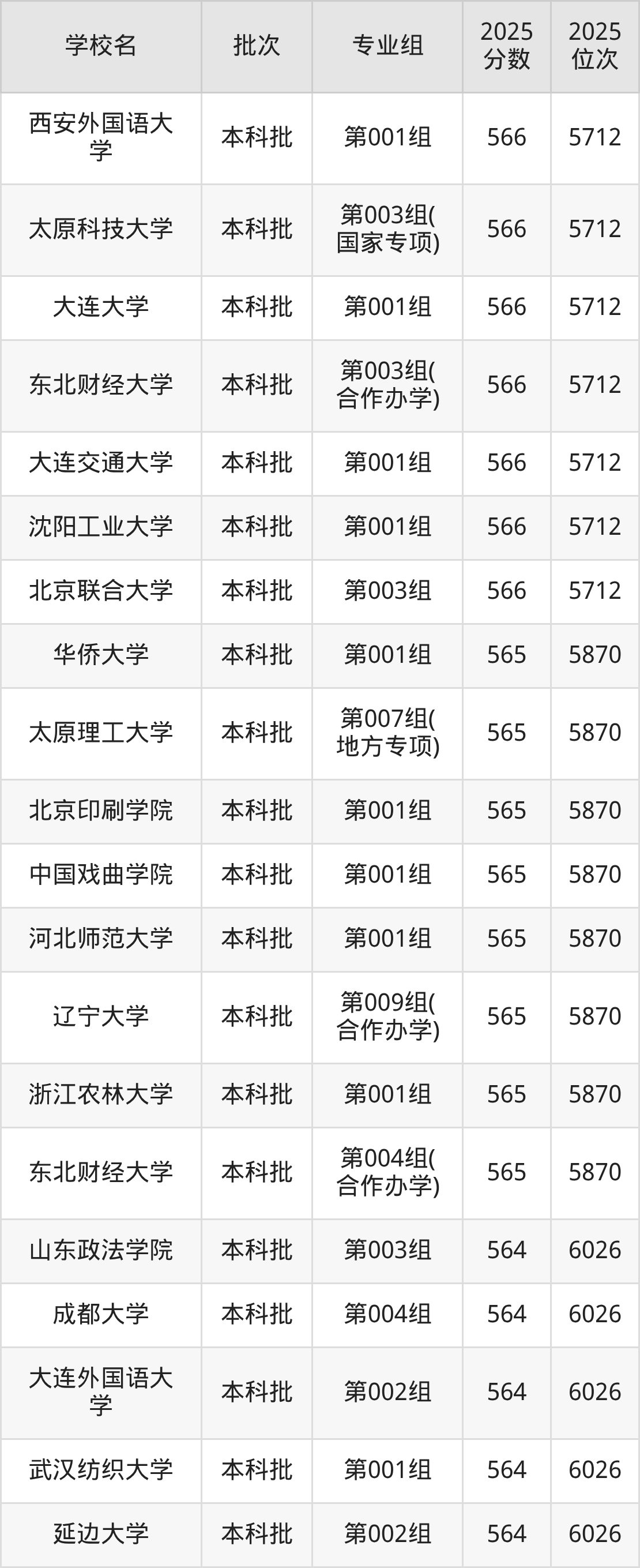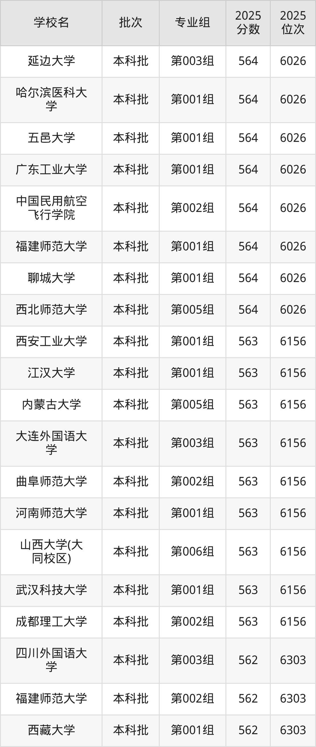 2025年山西高考历史类564分(5871名~6026名)能上的大学有大连外国语大学第002组、延边大学第002组、延边大学第003组、哈尔滨医科大学第001组等。