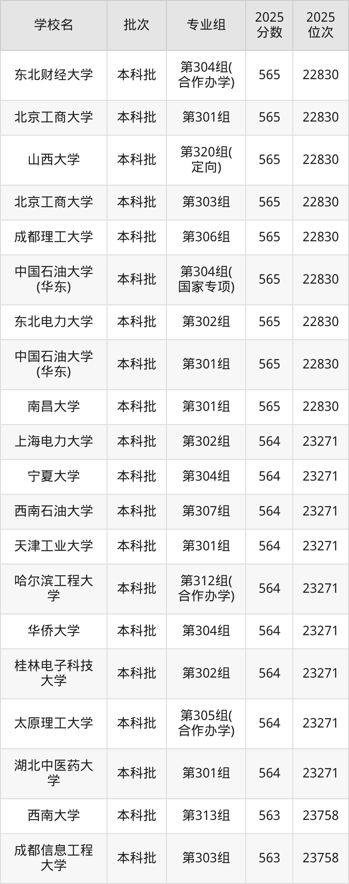 2025年山西高考物理类564分(22831名~23271名)能上的大学有天津工业大学第301组、哈尔滨工程大学第312组(合作办学)、上海电力大学第302组、华侨大学第304组等。