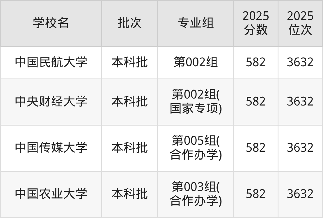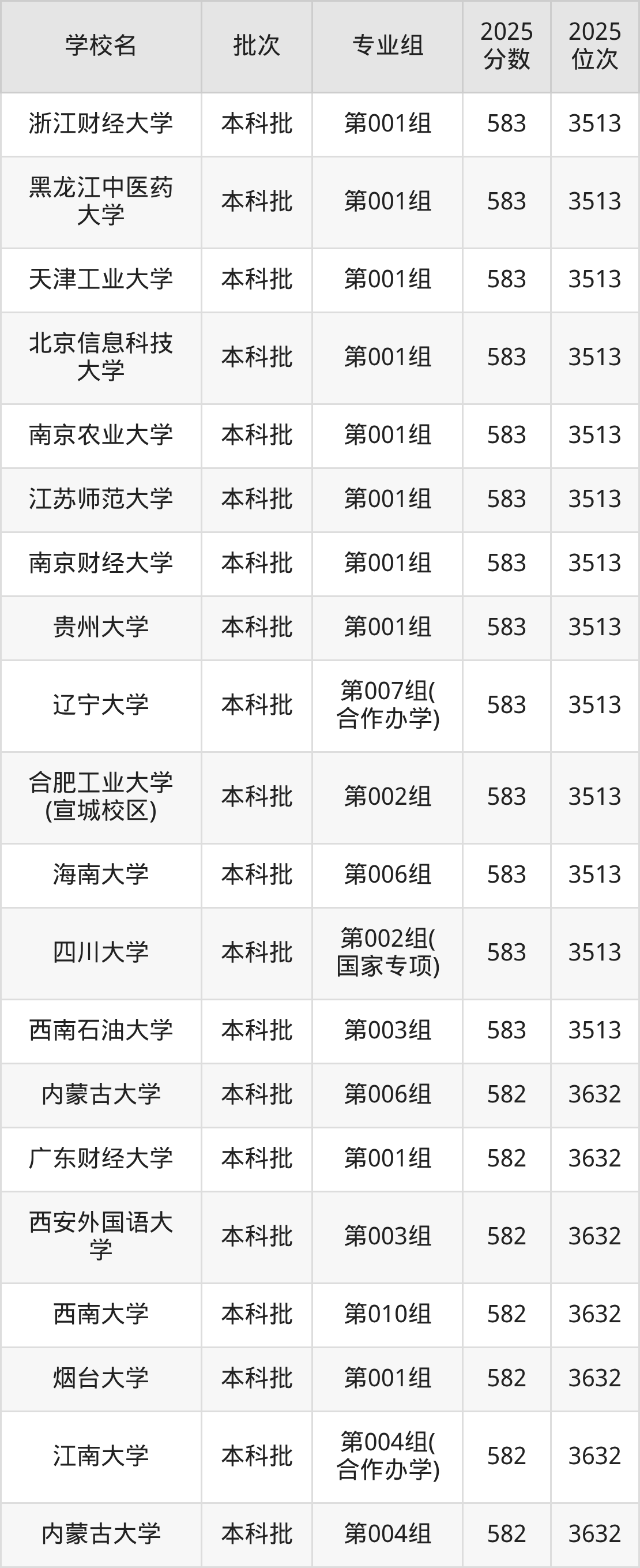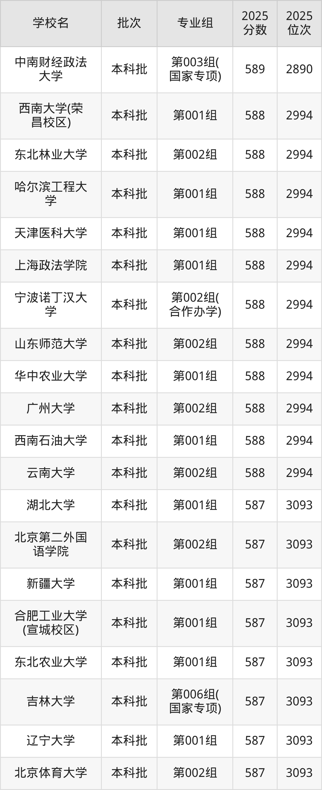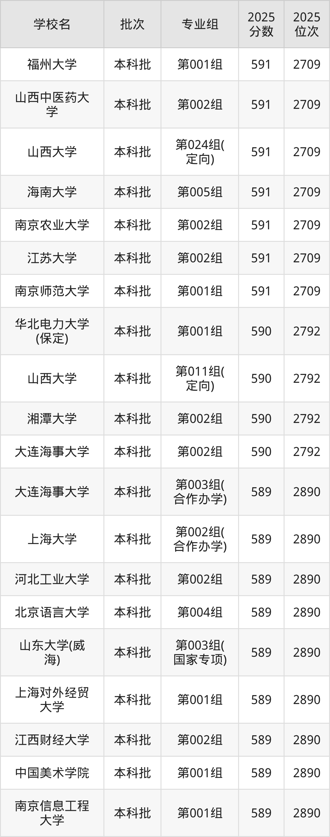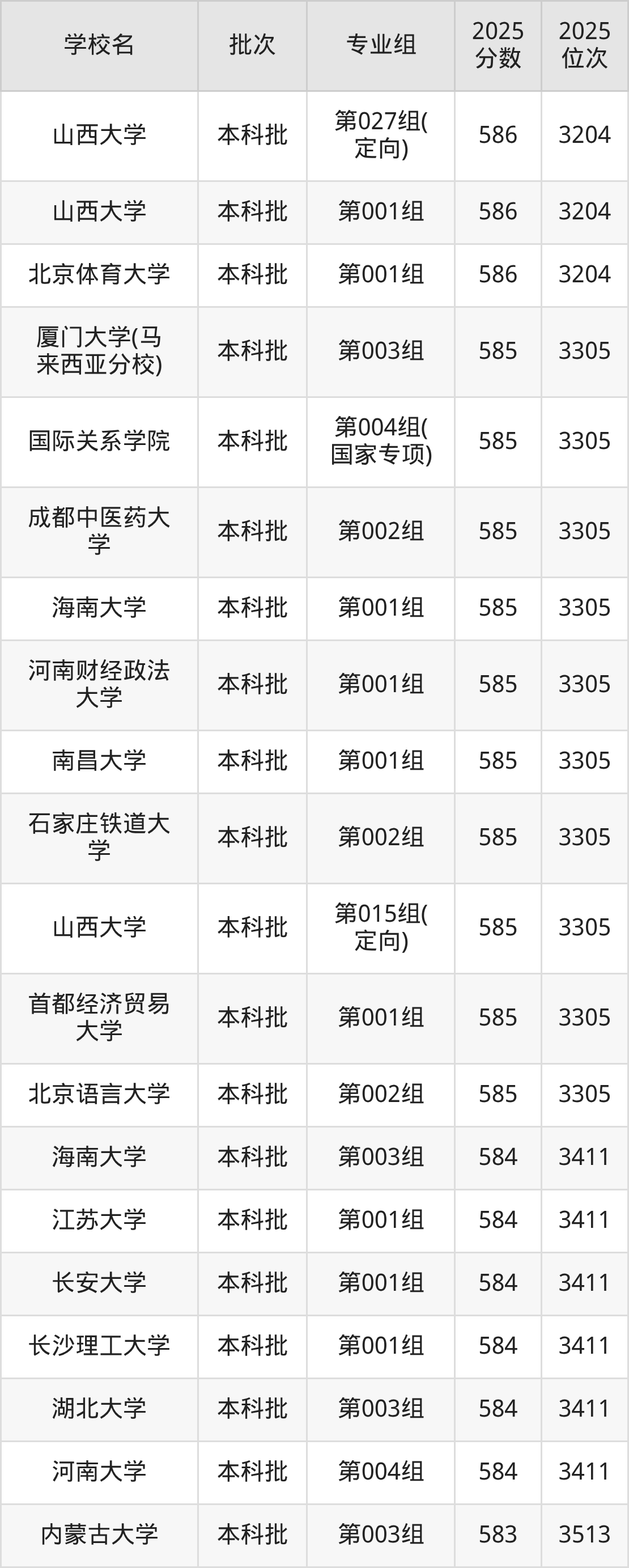 2025年山西高考历史类586分(3094名~3204名)能上的大学有北京体育大学第001组、山西大学第001组、山西大学第027组(定向)。
