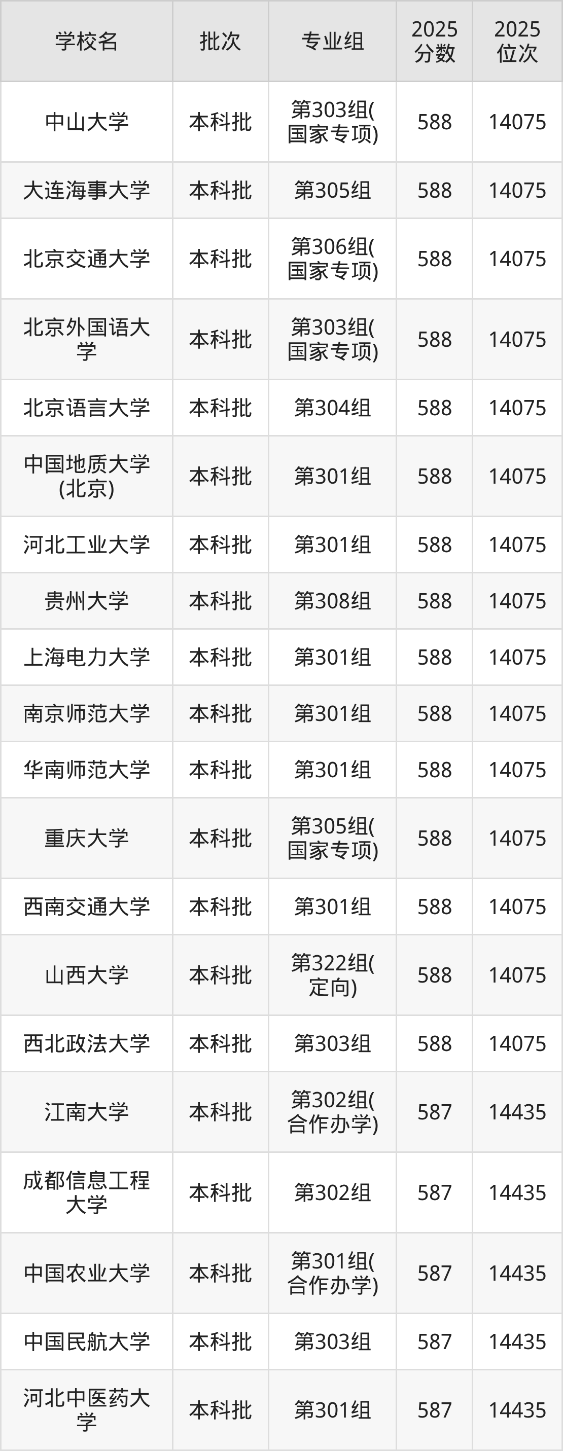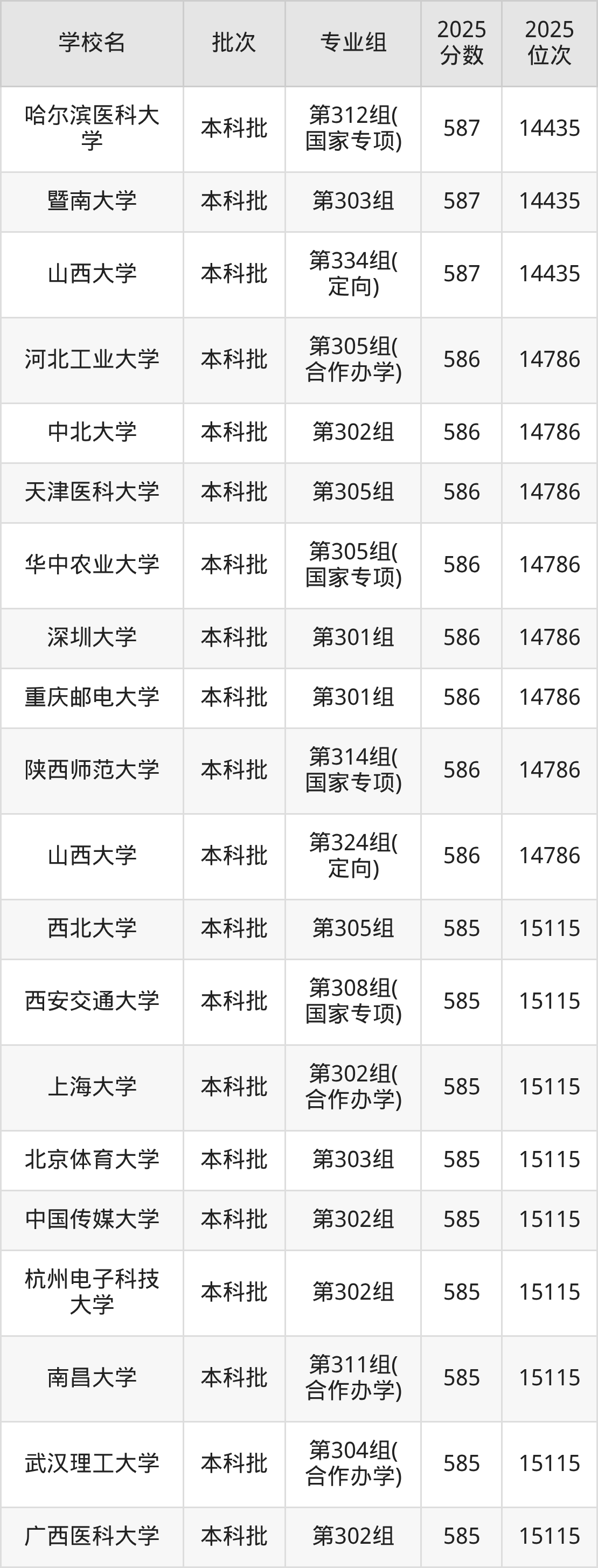 2025年山西高考物理类586分(14436名~14786名)能上的大学有天津医科大学第305组、河北工业大学第305组(合作办学)、华中农业大学第305组(国家专项)、深圳大学第301组等。