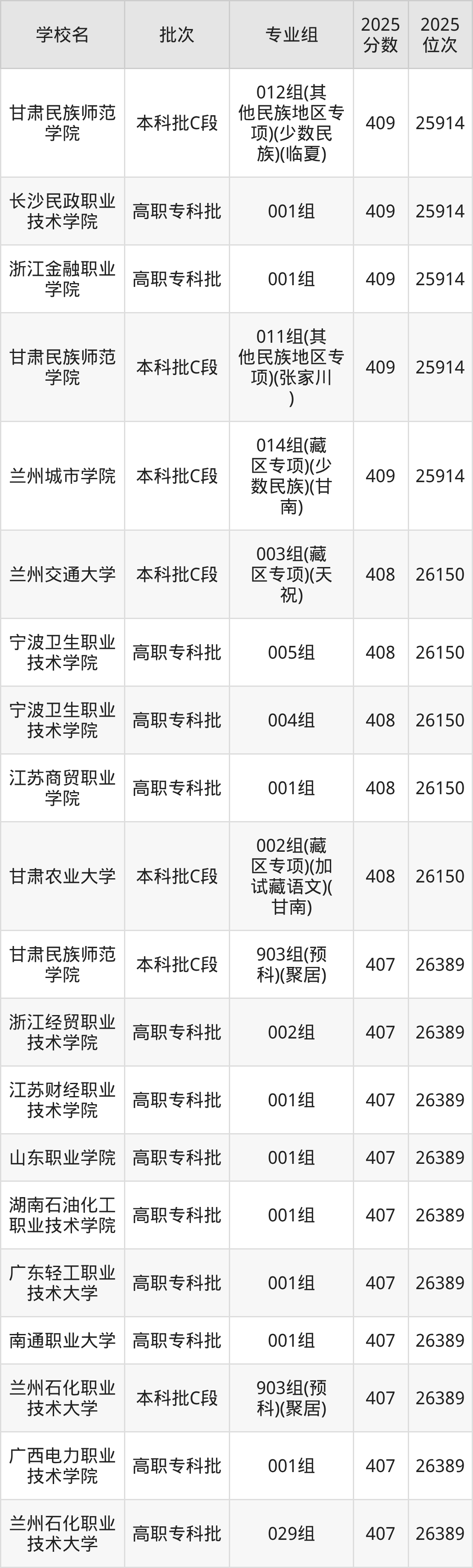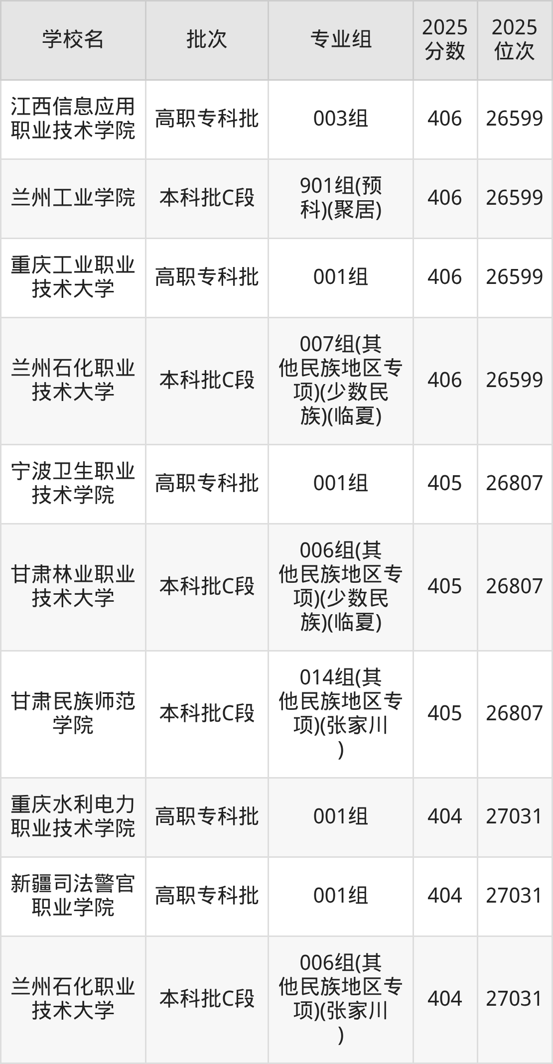 2025年甘肃高考历史类406分(26390名~26599名)能上的大学有兰州工业学院901组(预科)(聚居)、兰州石化职业技术大学007组(其他民族地区专项)(少数民族)(临夏)、江西信息应用职业技术学院003组、重庆工业职业技术大学001组。