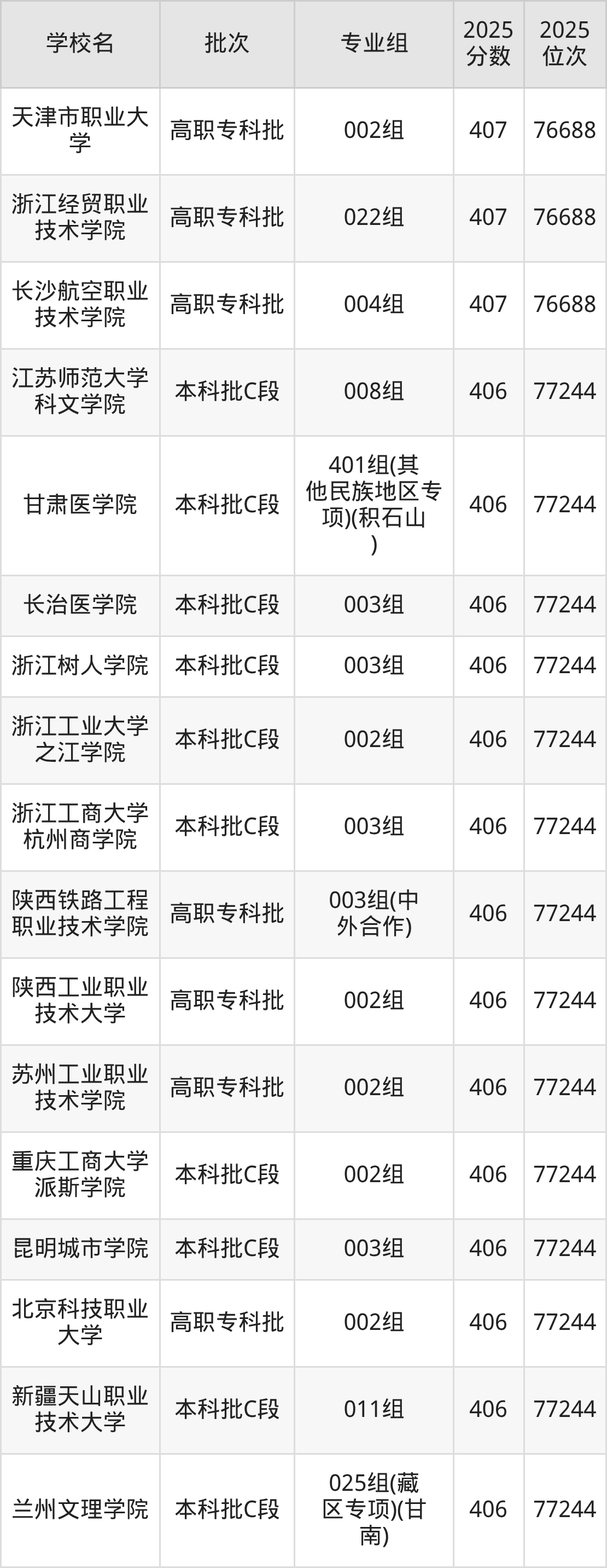 2025年甘肃高考物理类406分(76689名~77244名)能上的大学有长治医学院003组、江苏师范大学科文学院008组、浙江树人学院003组、浙江工业大学之江学院002组等。