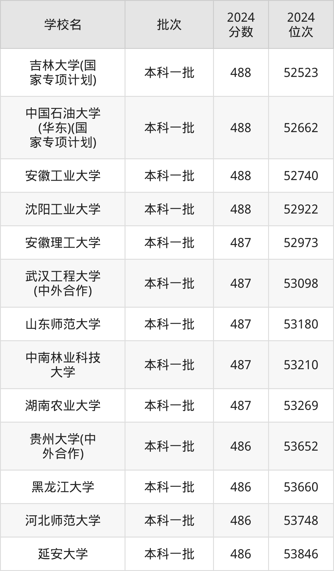 2024年陕西高考理科487分(52964名~53576名)能上的大学有安徽理工大学、山东师范大学、湖南农业大学、中南林业科技大学等。