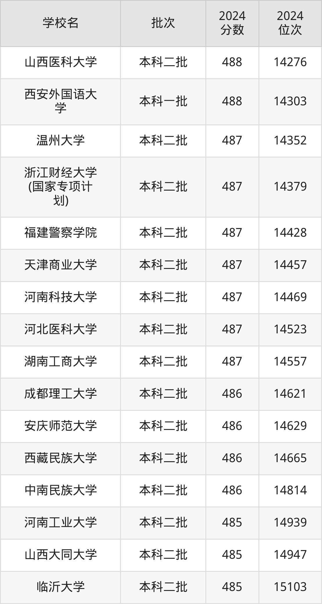 2024年陕西高考文科487分(14304名~14607名)能上的大学有天津商业大学、河北医科大学、温州大学、福建警察学院等。