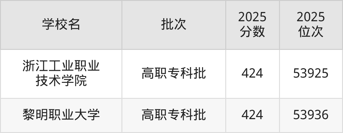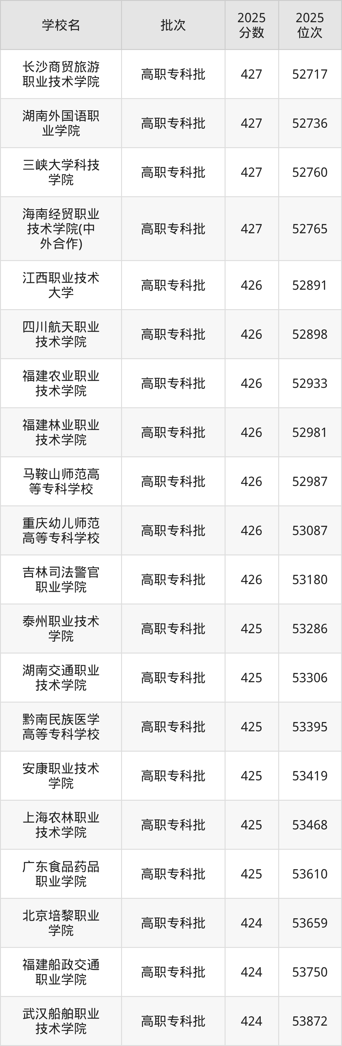 2025年贵州高考历史类425分(53204名~53640名)能上的大学有黔南民族医学高等专科学校、上海农林职业技术学院、广东食品药品职业学院、湖南交通职业技术学院等。