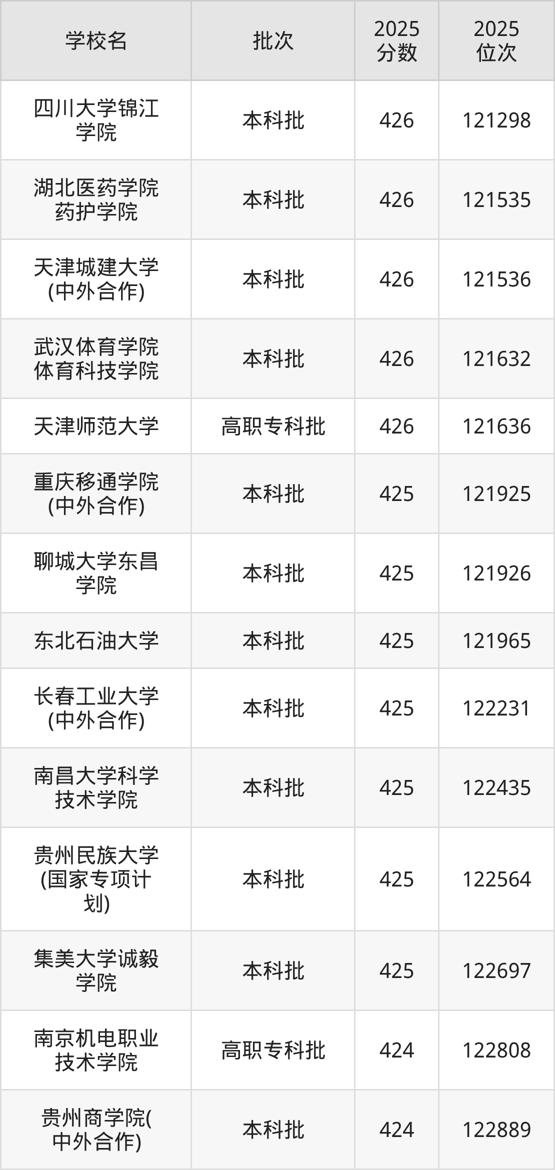 2025年贵州高考物理类425分(121712名~122735名)能上的大学有南昌大学科学技术学院、重庆移通学院(中外合作)、集美大学诚毅学院、长春工业大学(中外合作)等。