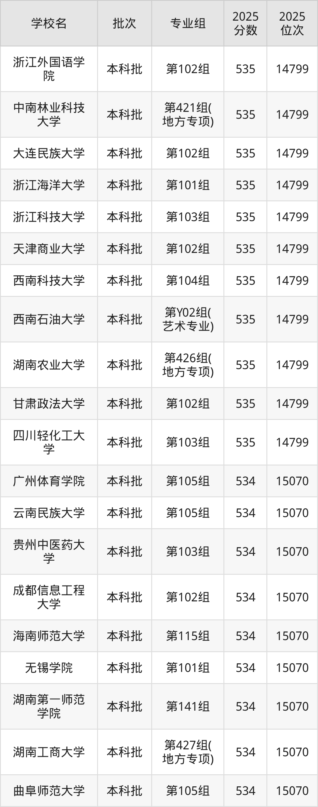 这些都是2026年高考历史类15071名~15371名考生可以报考的大学,更多学校名单如下表所示:
