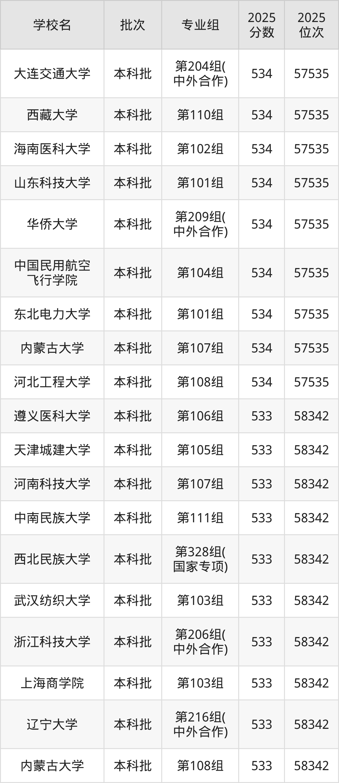 2025年湖南高考物理类533分(57536名~58342名)能上的大学有天津城建大学第105组、内蒙古大学第108组、辽宁大学第216组(中外合作)、上海商学院第103组等。