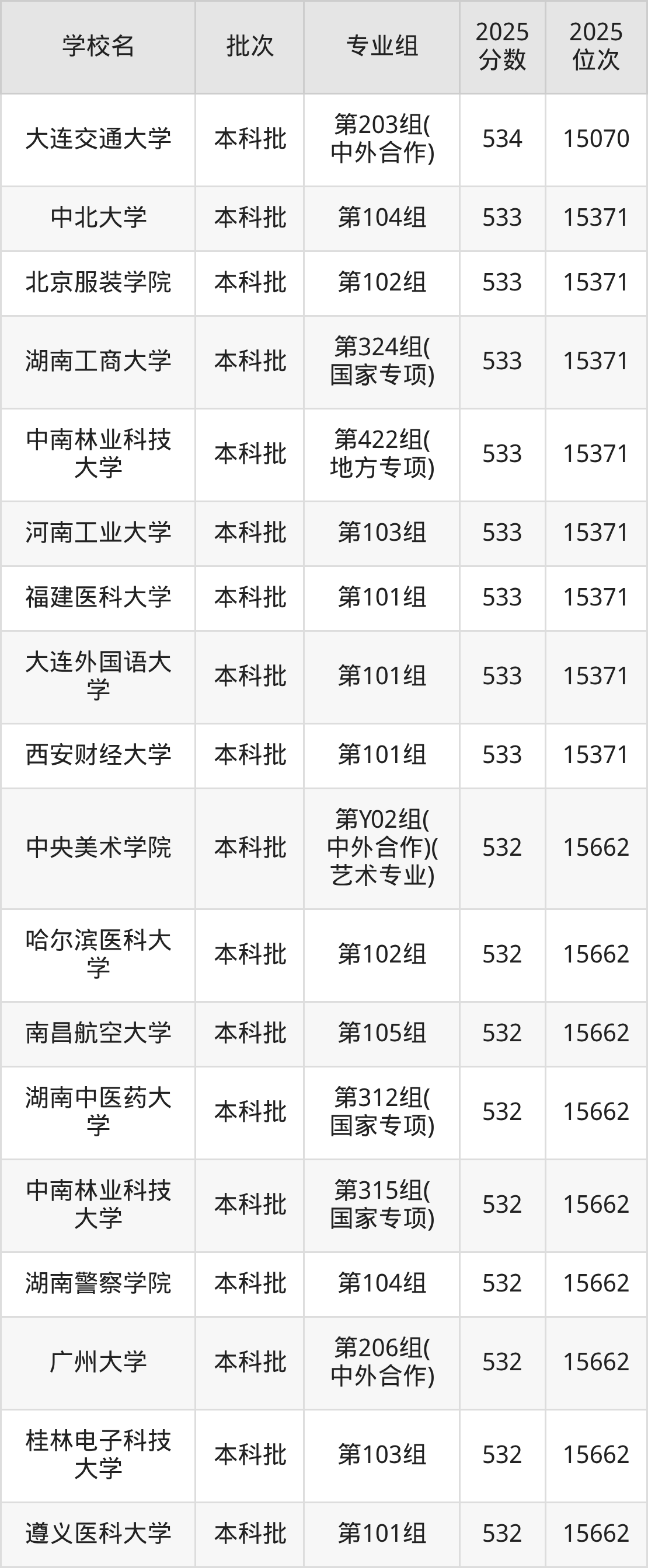 2025年湖南高考历史类533分(15071名~15371名)能上的大学有北京服装学院第102组、中北大学第104组、大连外国语大学第101组、福建医科大学第101组等。