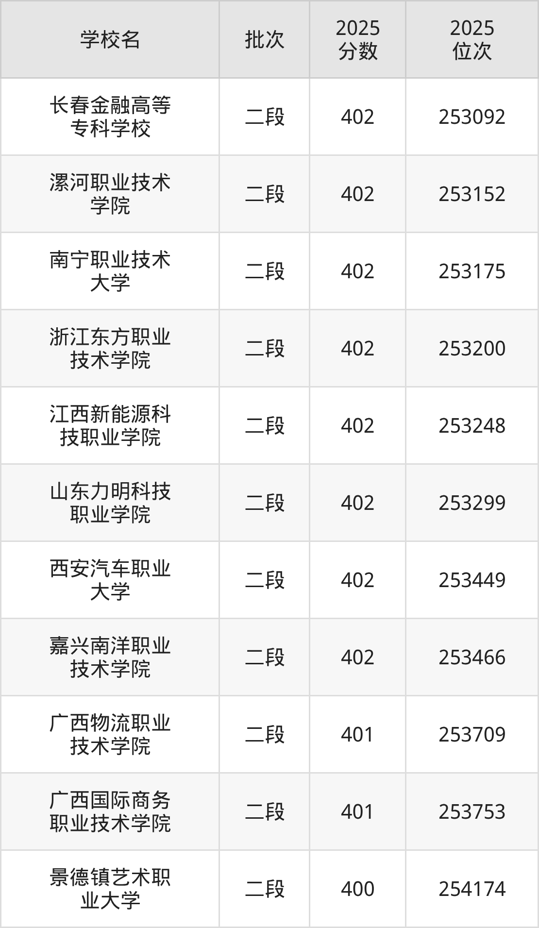 这些都是2026年高考253542名~254038名考生可以报考的大学,更多学校名单如下表所示: