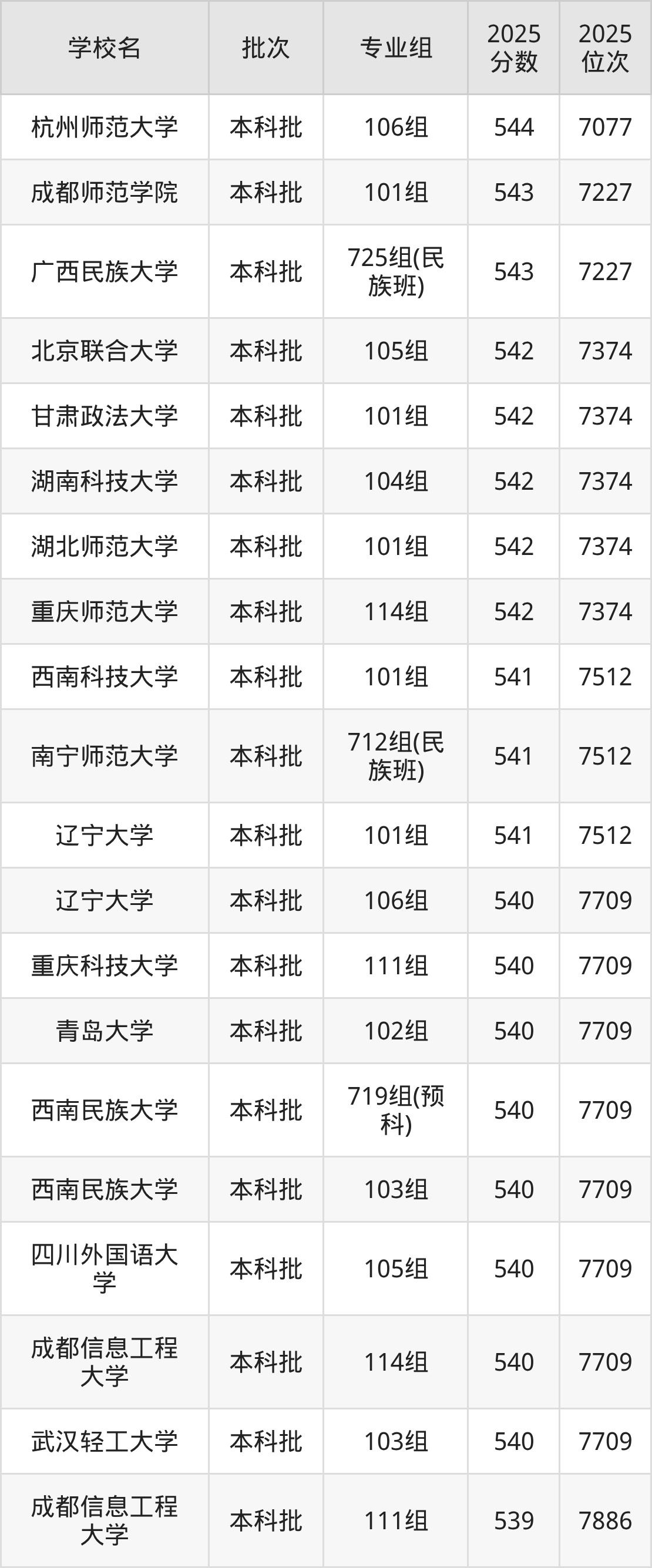 2025年广西高考历史类540分(7513名~7709名)能上的大学有辽宁大学106组、武汉轻工大学103组、成都信息工程大学114组、四川外国语大学105组等。