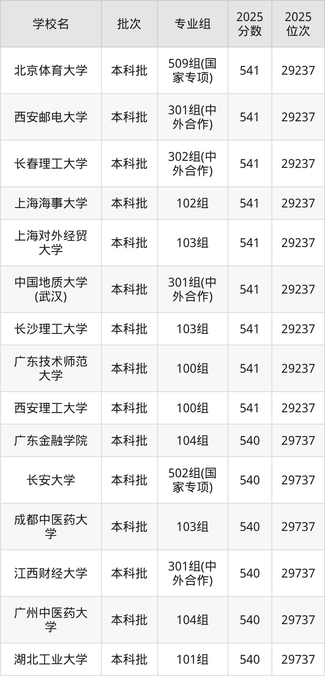 2025年广西高考物理类540分(29238名~29737名)能上的大学有江西财经大学301组(中外合作)、湖北工业大学101组、广州中医药大学104组、成都中医药大学103组等。